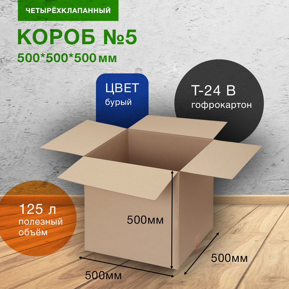 Картонный короб №5 для хранения вещей (большой), длиной 500 мм, шириной 500 мм и высотой 500 мм. Изготовлен из трехслойного картона марки Т-24. Полезный объём — 125 л.