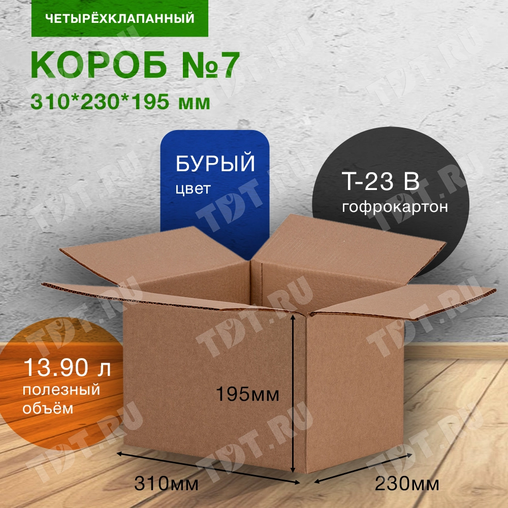 Картонный короб №7 для хранения вещей (маленький), длиной 310 мм, шириной 230 мм и высотой 195 мм. Изготовлен из трехслойного картона марки Т-23 В. Полезный объём — 13.9 л.