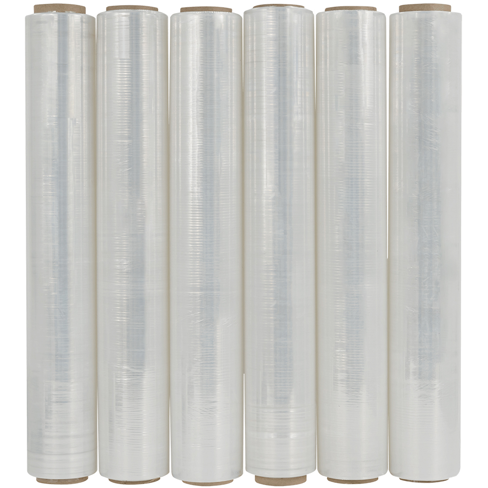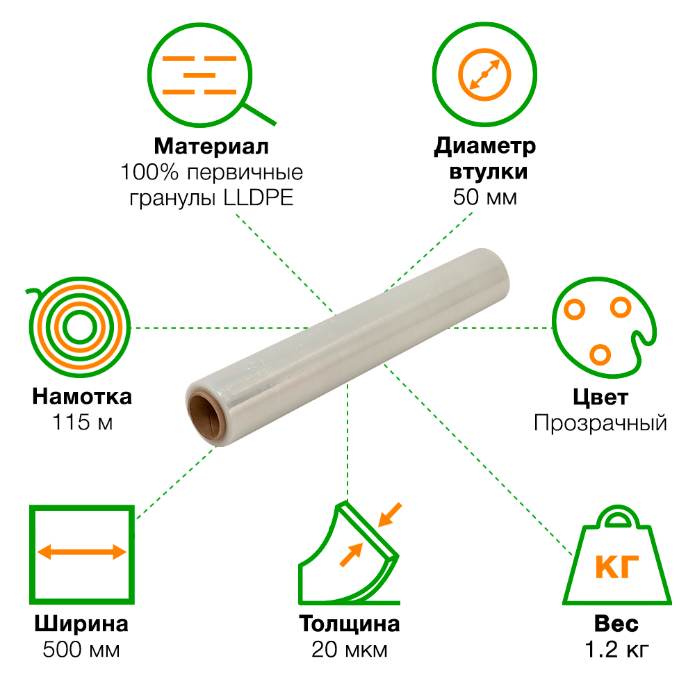 Прозрачная стрейч пленка, первого сорта, намоткой 115 м, шириной 500 мм, толщиной 20 мкм. Изготовлена из первичных гранул LLDPE. Производится в России.