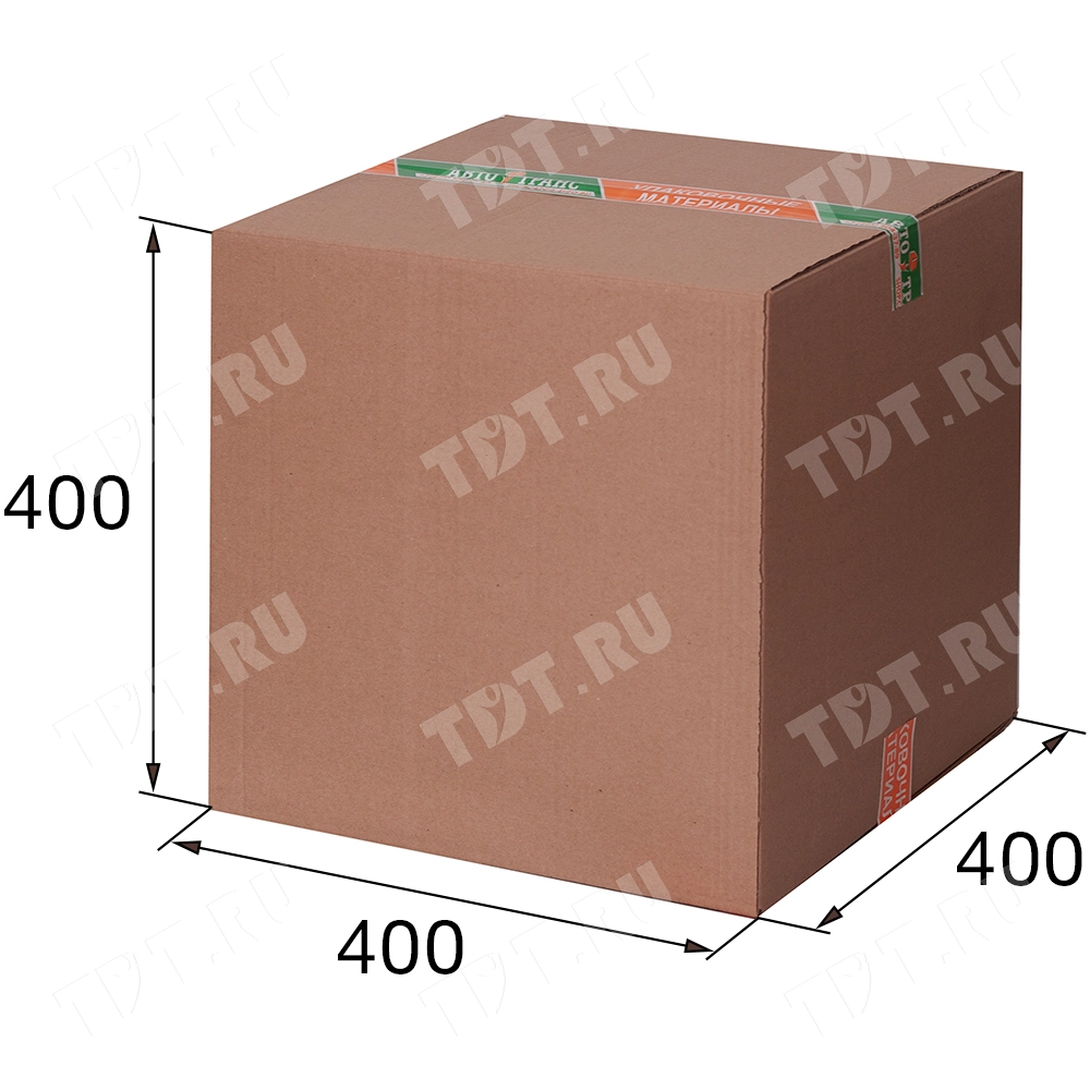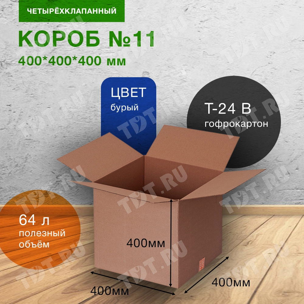 Квадратный картонный короб №11 для переезда, длиной 400 мм, шириной 400 мм и высотой 400 мм. Изготовлен из трехслойного картона марки Т-24. Полезный объём — 64 л.