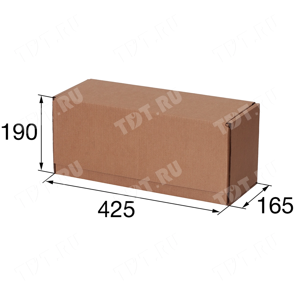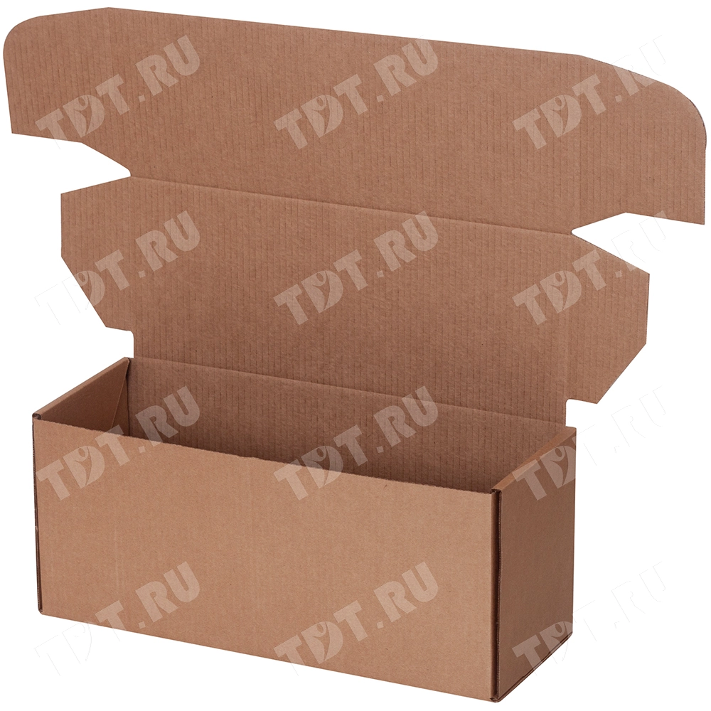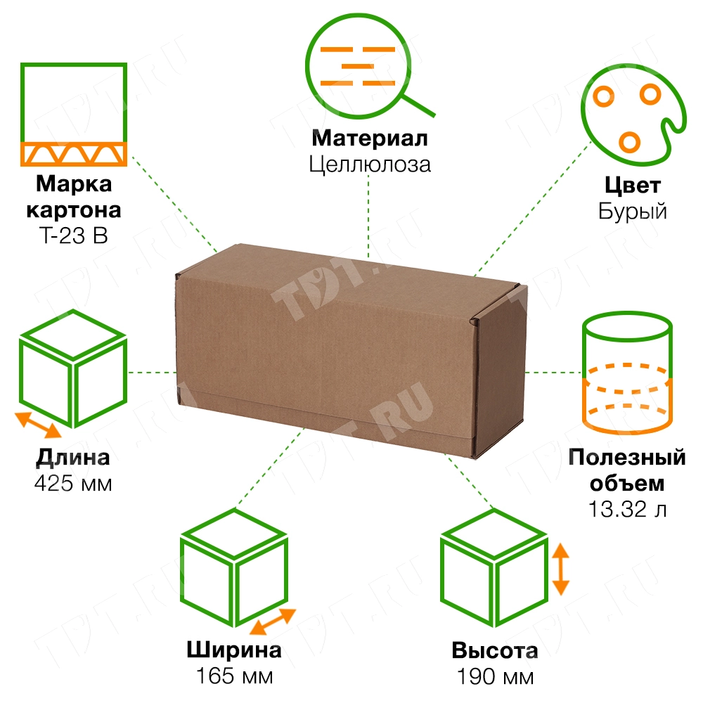 Почтовый короб тип «В» бурого цвета, длиной 425 мм, шириной 165 мм и высотой 190 мм. Изготовлен из трёхслойного гофрокартона Т-23 В. Полезный объём — 13.32 л.