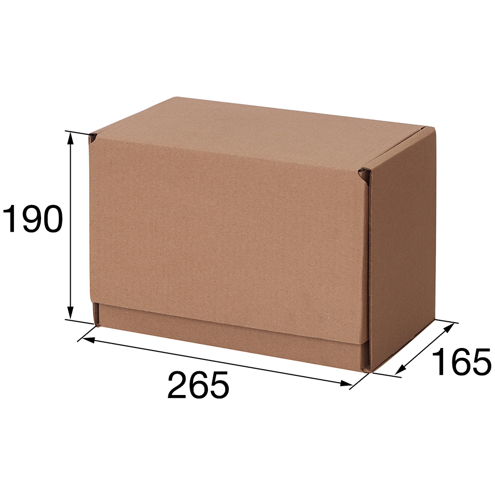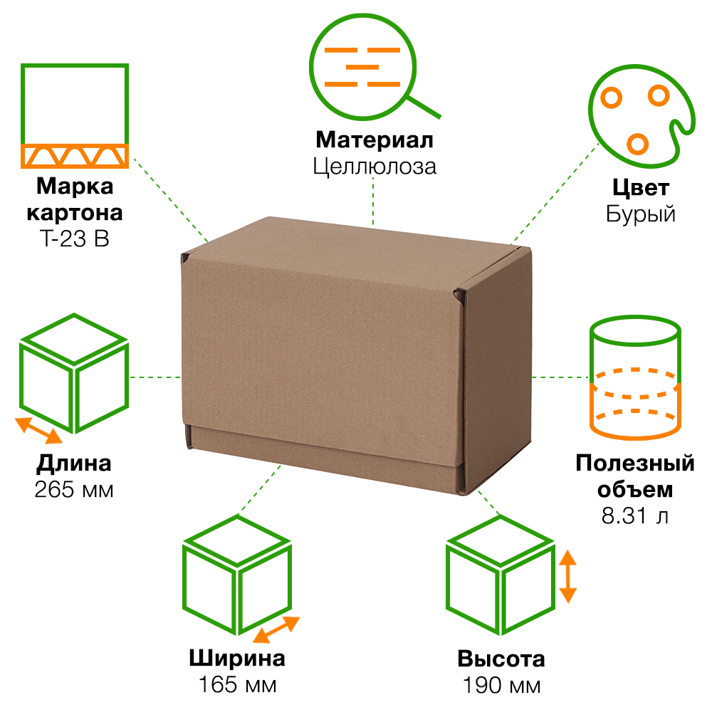 Почтовый короб тип «Г» бурого цвета, длиной 265 мм, шириной 165 мм и высотой 190 мм. Изготовлен из трёхслойного гофрокартона Т-23 В. Полезный объём — 8.31 л.
