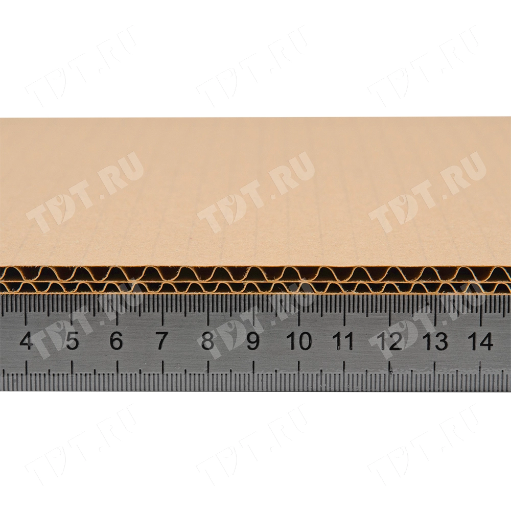 Пятислойный лист гофрокартона, бурого цвета, марки П-32, длиной 1200 мм, шириной 800 мм, толщиной 4.8-6.2 мм, площадью 0.96 м², направление волны вдоль стороны 1200 мм. Для производства листов используется только первичное высококачественное сырье. Производится в России.