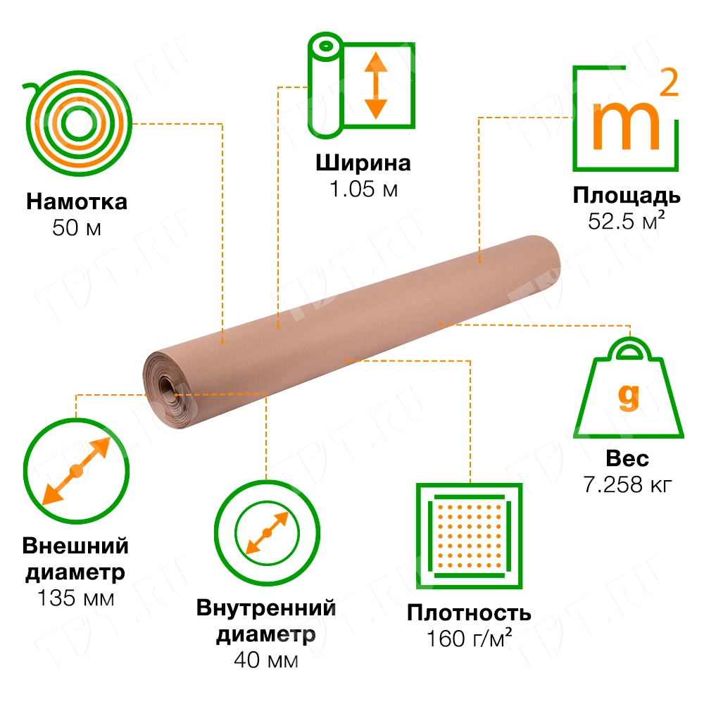 Сверхплотная оберточная бумага из вторичного сырья, шириной 105 см, намоткой 50 м, плотностью 160 г/м². Производится в России. Не трется на заломах и не рвется при ударах, пропускает воздух, поглощает влагу и сохраняет тепло.