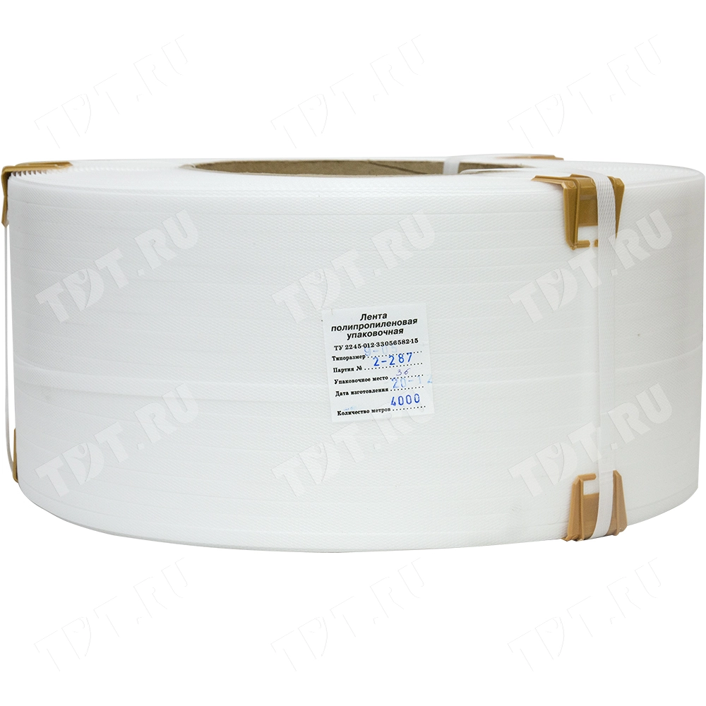 Упаковочная полипропиленовая лента (ПП) Лентапром, белого цвета, намоткой 4000 м, шириной 9 мм, толщиной 0.5 мм, усилием на разрыв 90 кГс, весом 10.442 кг, транспортировочным объемом 0.02928 м³. Диапазон рабочих температур от -30 до +60°C. Производится в России.