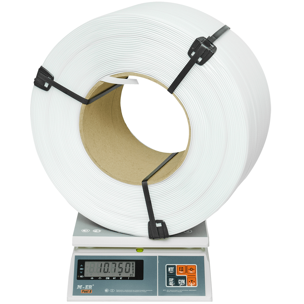 Упаковочная полипропиленовая лента (ПП) Лентапром, белого цвета, намоткой 3000 м, шириной 12 мм, толщиной 0.6 мм, усилием на разрыв 130 кГс, весом 10.75 кг, транспортировочным объемом 0.031862 м³. Диапазон рабочих температур от -30 до +60°C. Производится в России.