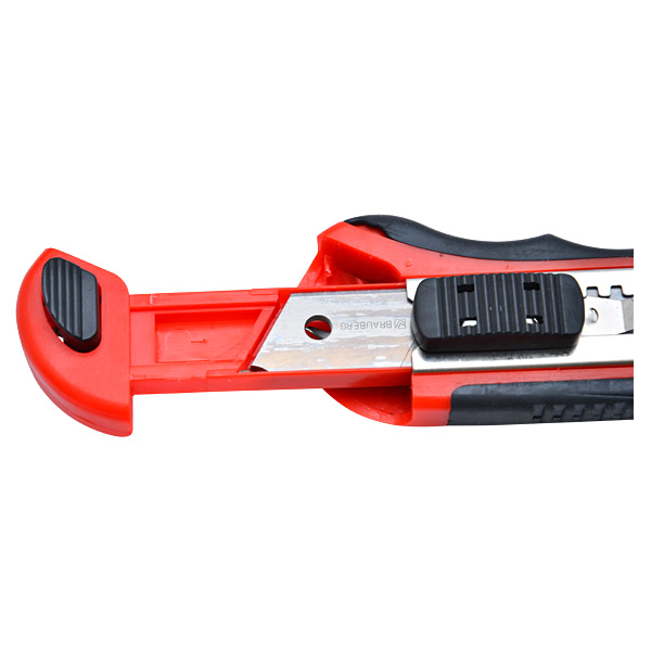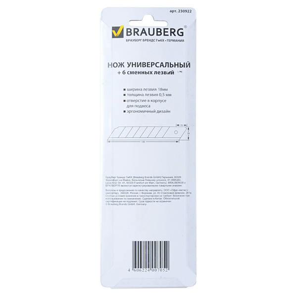 Универсальный нож Brauberg + 6 сменных лезвий, код производителя 230922, шириной 18 мм, толщина 0.5 мм, черно-красного цвета. Материал корпуса – пластик и резина. Продаются в картонной упаковке с европодвесом. Производится в России.