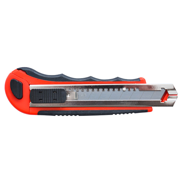 У этого канцелярского ножа пластиковый корпус со специальными резиновыми вставками, которые позволяют надежно фиксировать инструмент во время работы.