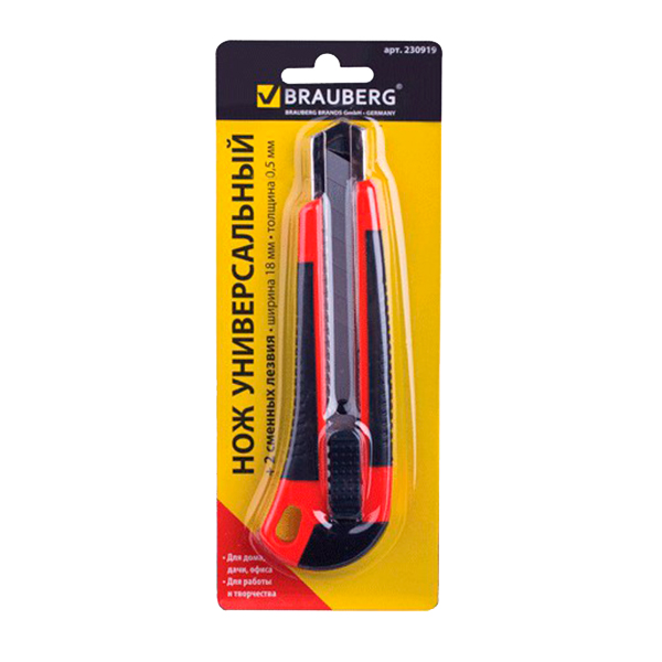 Универсальный нож Brauberg + 2 сменных лезвия, код производителя 230919, шириной 18 мм, толщиной 0.5 мм, черно-красного цвета. Материал корпуса – пластик и резина. Продаются в картонной упаковке с европодвесом. Производится в России.