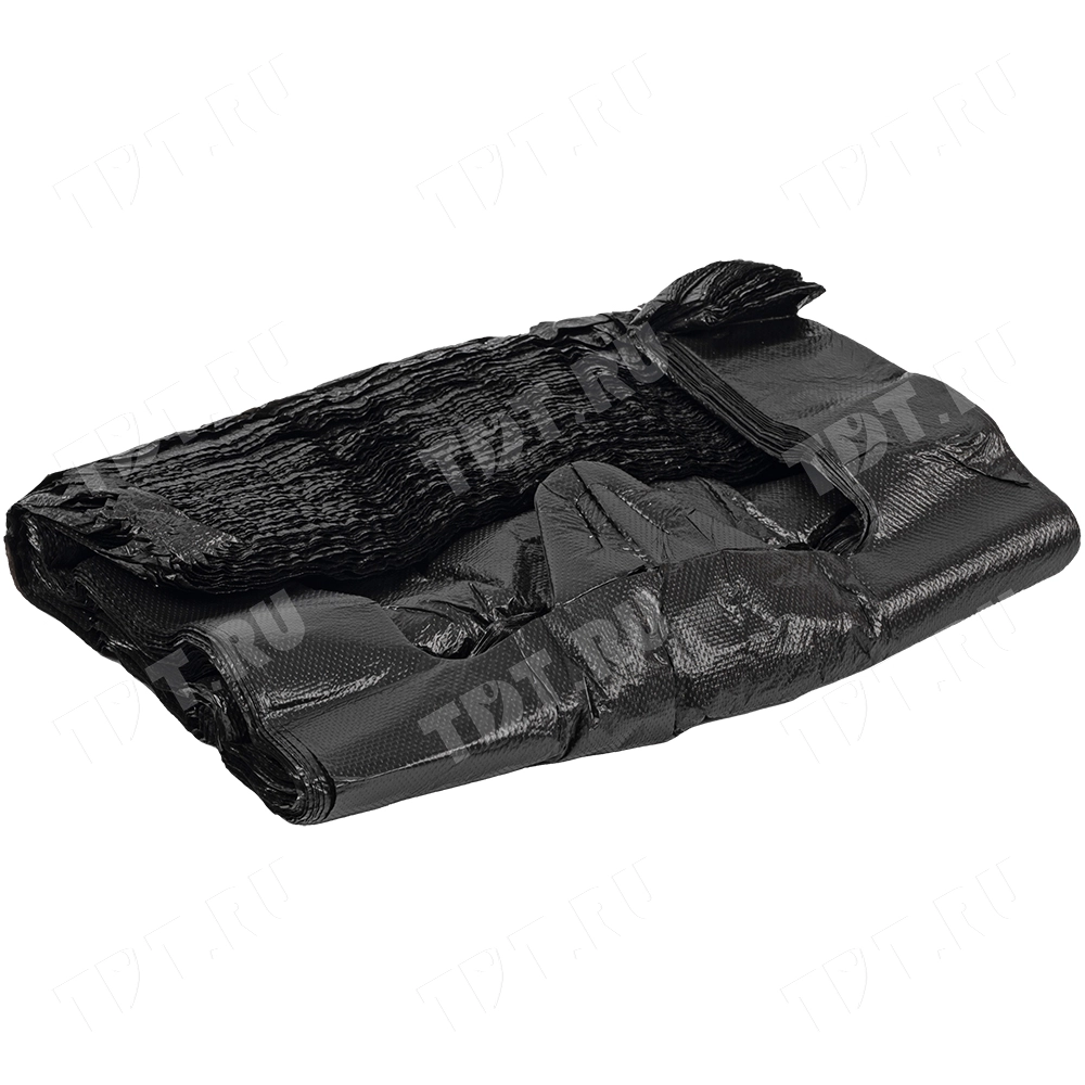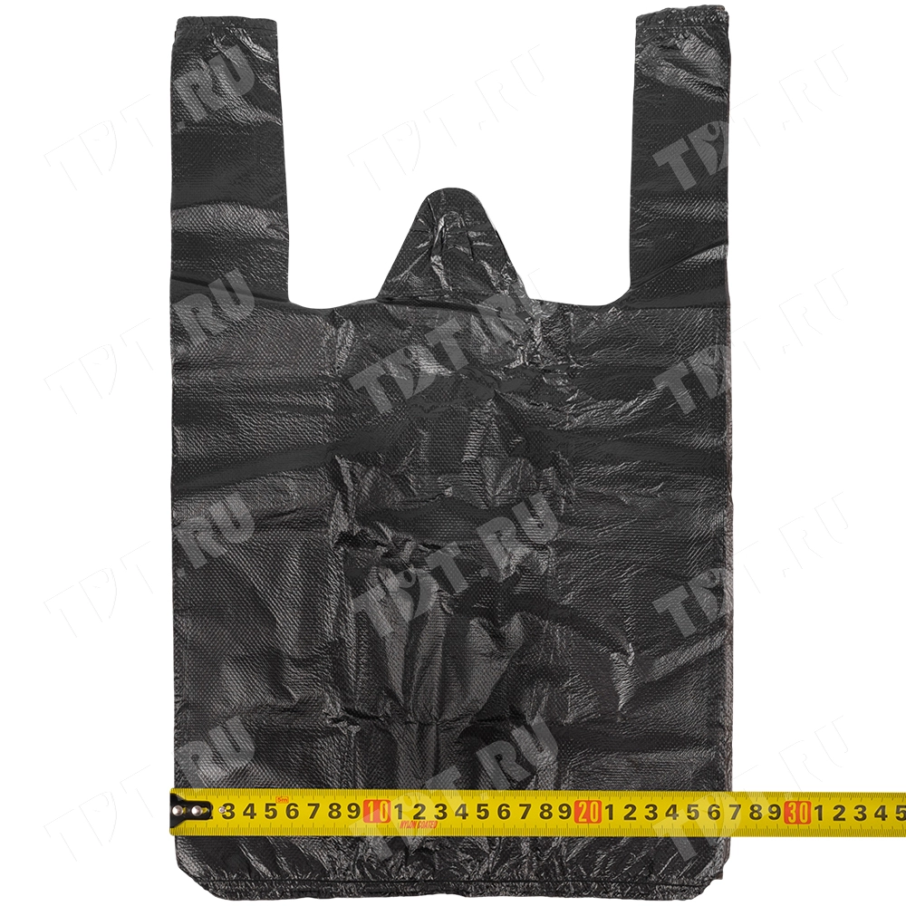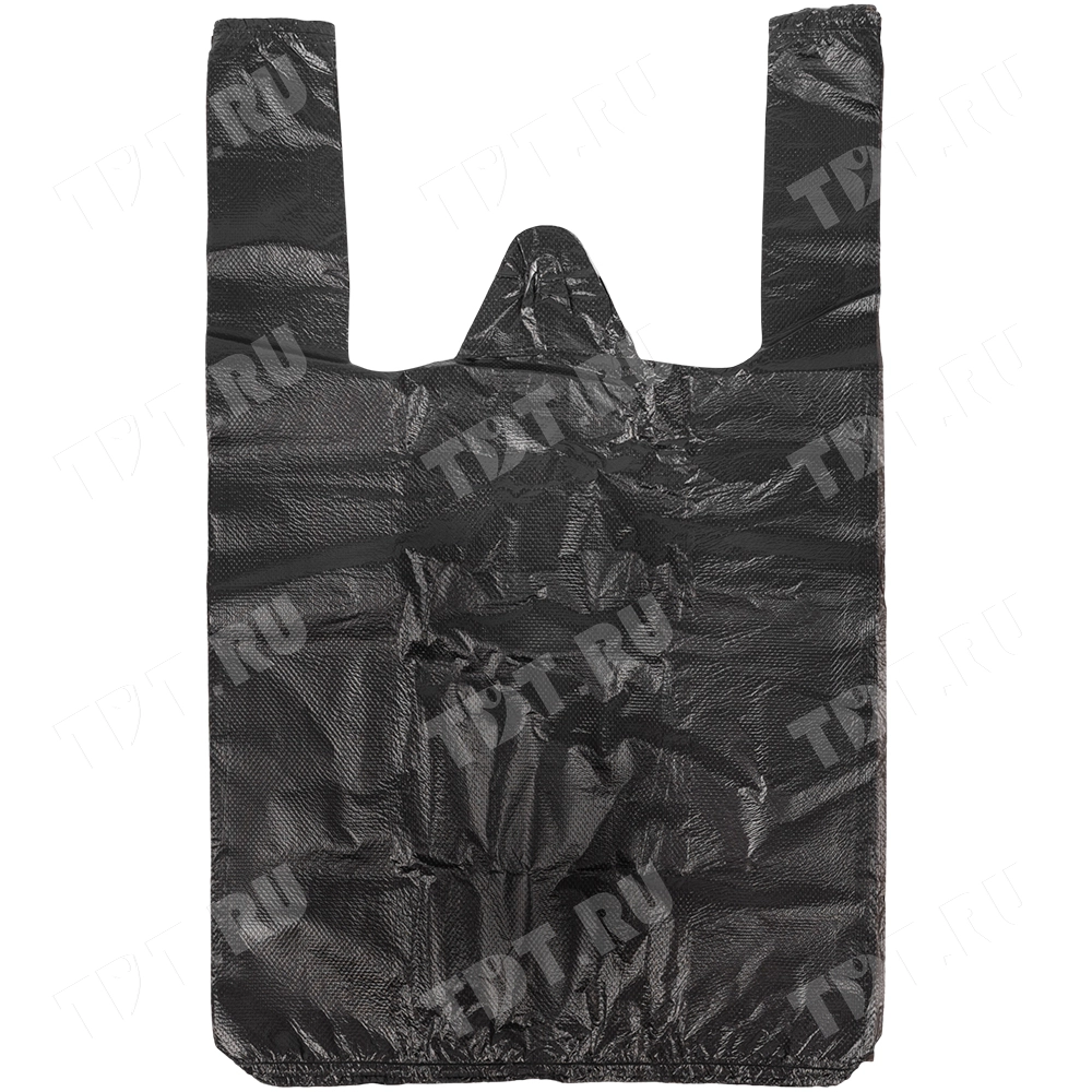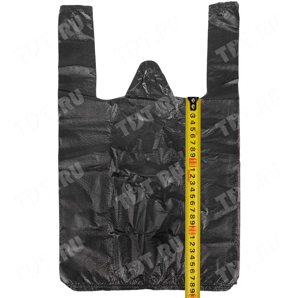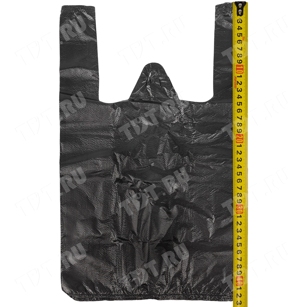 Полиэтиленовые пакеты майка ПНД, черного цвета, длиной 45 см, шириной 25+12 см, толщиной 9 мкм, в упаковке 100 штук. Материал – полиэтилен низкого давления. Производятся в России.