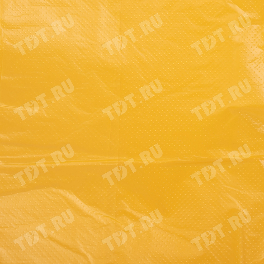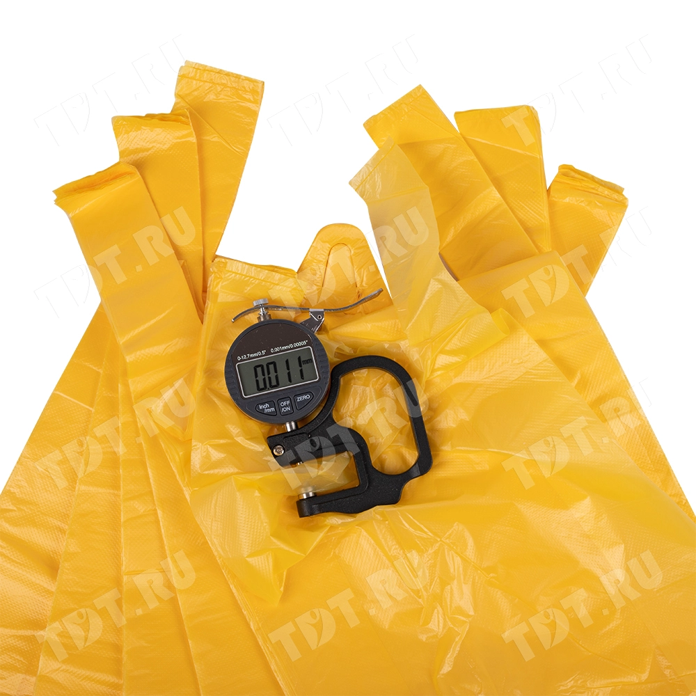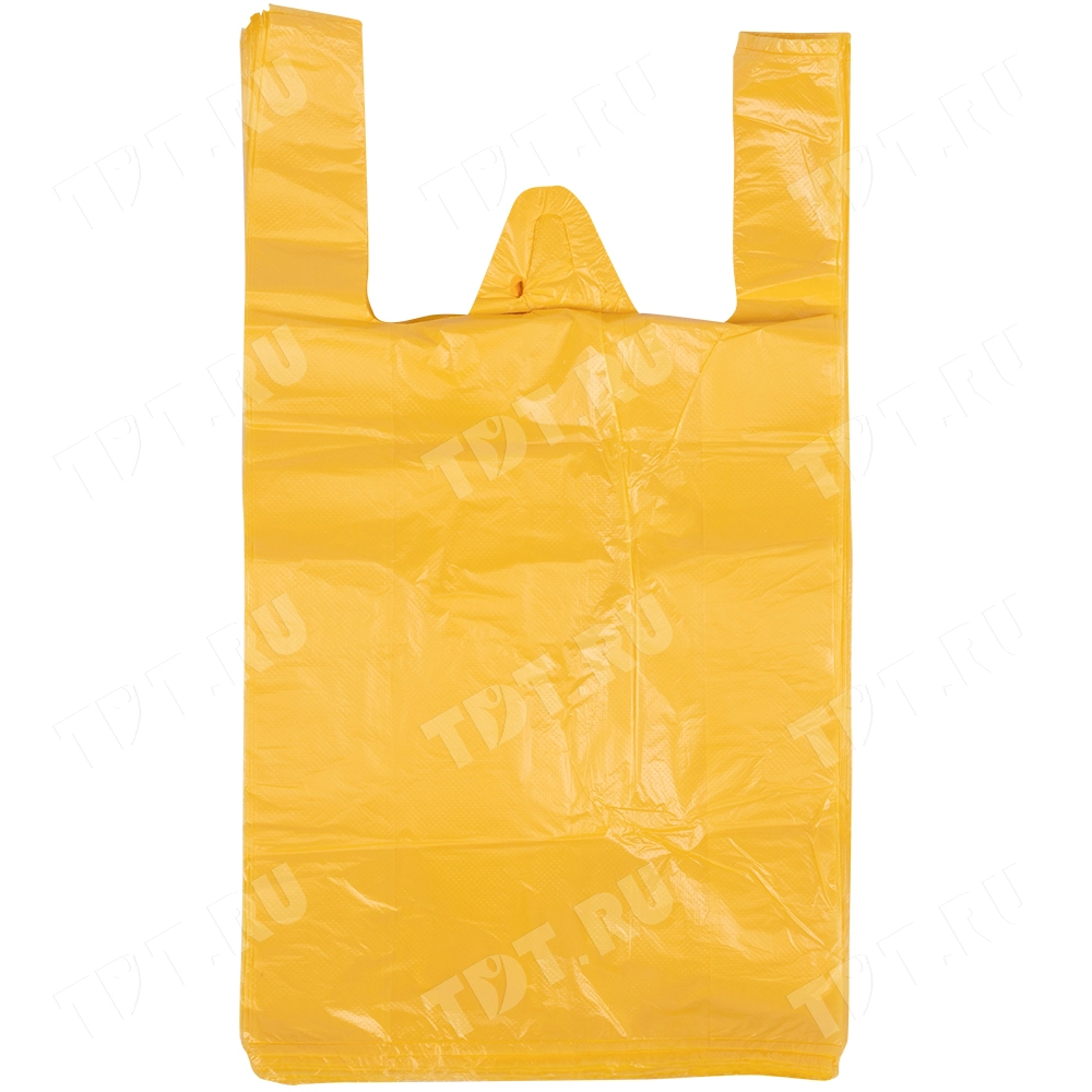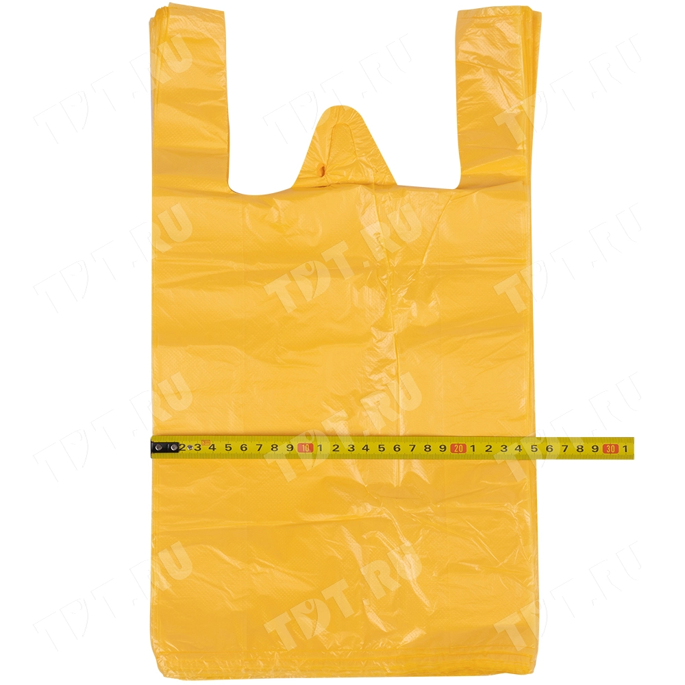 Полиэтиленовые пакеты майка ПНД, желтого цвета, длиной 45 см, шириной 25+12 см, толщиной 11 мкм, в упаковке 100 штук. Материал – полиэтилен низкого давления. Производятся в России.