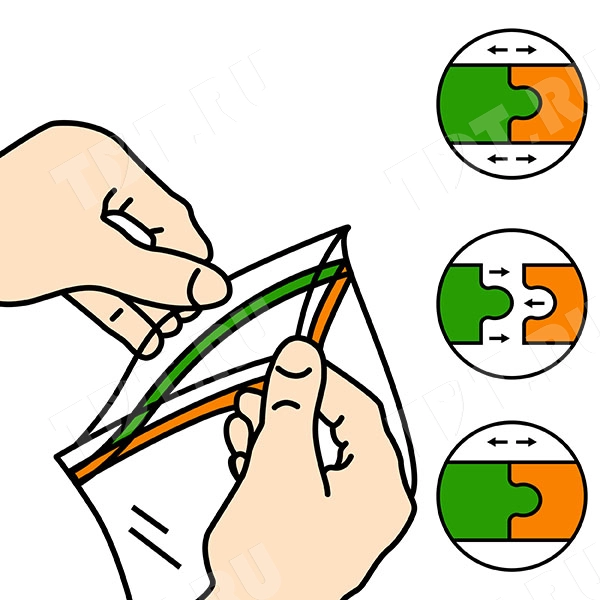 Пакеты Zip-Lock, прозрачного цвета с полосой для надписи, длиной 150 мм, шириной 100 мм, толщиной 60 мкм, в упаковке по 100 штук. Материал – полиэтилен высокого давления (ПВД). Производятся в России.