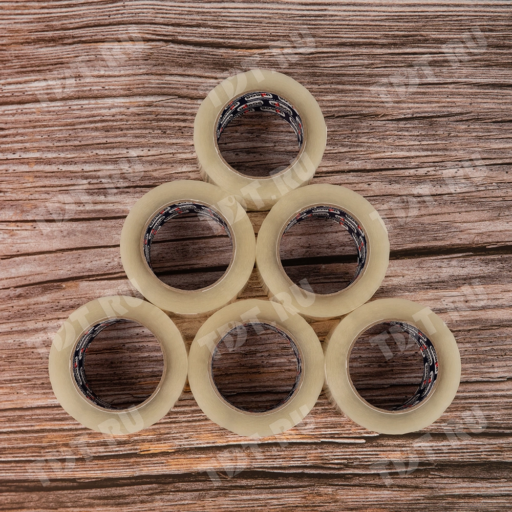 В спайке полиэтиленовой пленкой - 6 роликов скотча, в одной коробке - 36 роликов (6 спаек по 6 роликов).