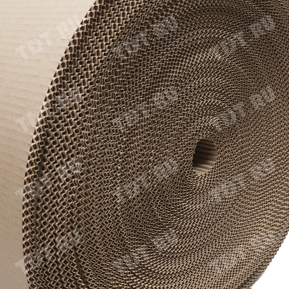 Рулонный гофрокартон бурого цвета, намоткой 50 м, шириной 1.05 м, толщиной 2.8-3.0 мм, площадью 52.5 м². Производится в России.