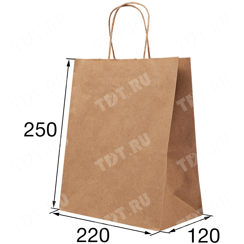 Бумажный крафт пакет с крученой ручкой шириной 120 мм, длиной 220 мм, высотой 250 мм изготовлен из экологичного материала. Пакеты производятся в России.