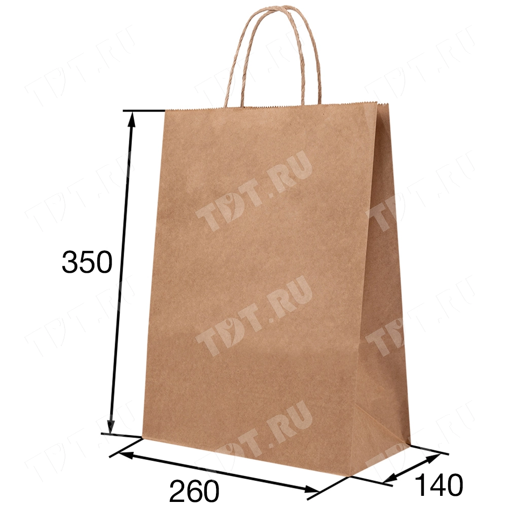 Бумажный крафт пакет с крученой ручкой шириной 140 мм, длиной 260 мм, высотой 350 мм изготовлен из экологичного материала. Пакеты производятся в России.