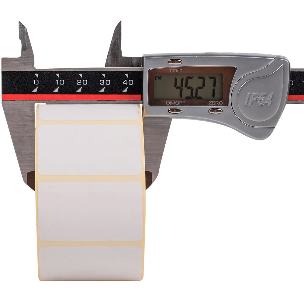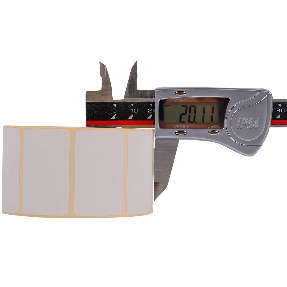 Самоклеящиеся этикетки ЭКО из матовой бумаги белого цвета, шириной 43 мм, высотой 25 мм, диаметром втулки 40 мм, количеством в рулоне по 1000 штук. Производятся в России. Термоэтикетки ЭКО в рулонах предназначены для печати на принтерах без риббона. На этикетках есть специальный слой, который при нагреве термоголовки принтера темнеет, за счет этого происходит печать.