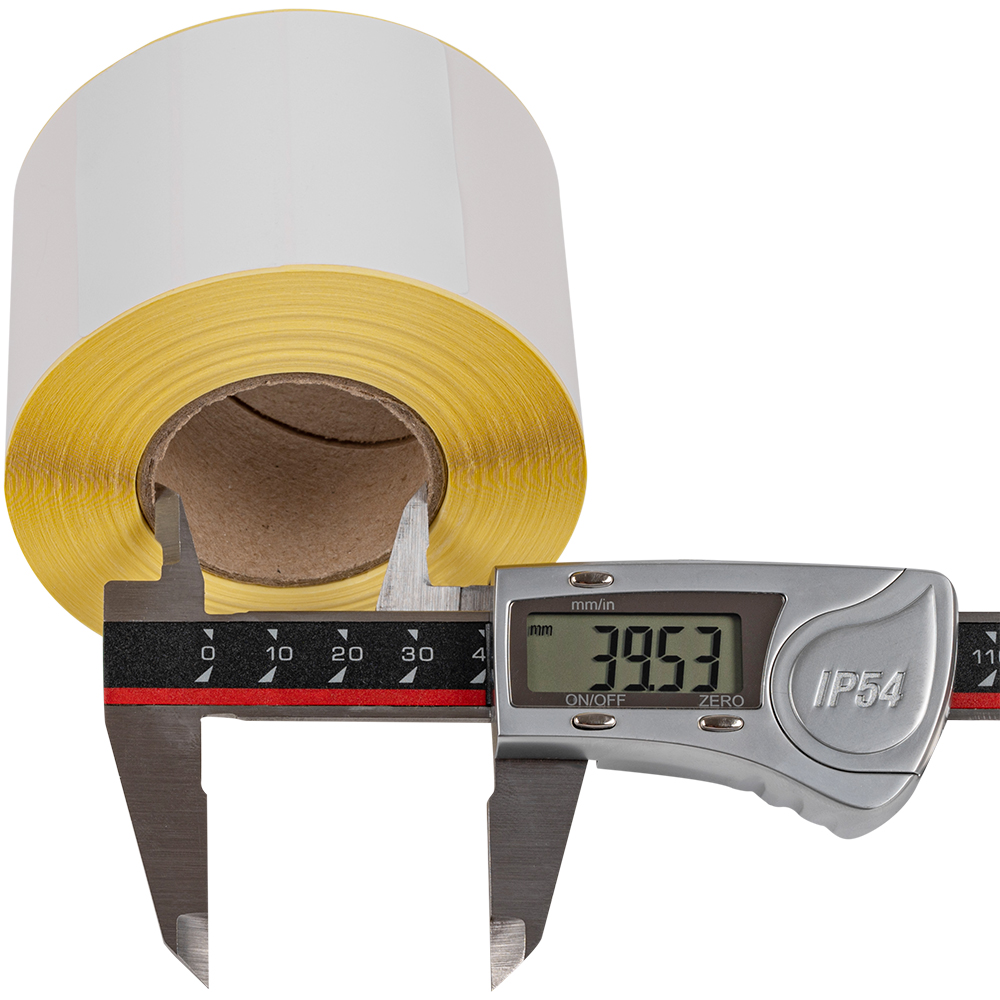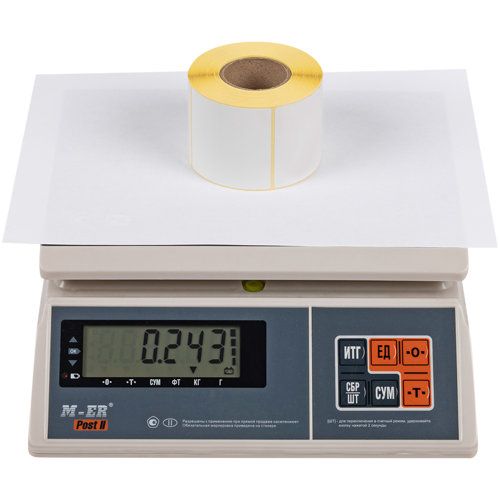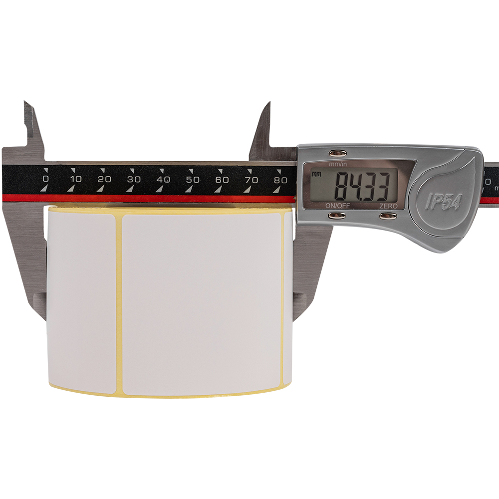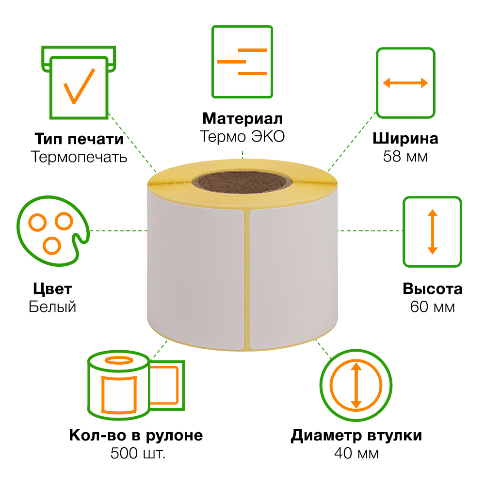 Самоклеящиеся этикетки ЭКО из матовой бумаги белого цвета, шириной 58 мм, высотой 60 мм, диаметром втулки 40 мм, количеством в рулоне по 500 штук. Производятся в России. Термоэтикетки ЭКО в рулонах предназначены для печати на принтерах без риббона. На этикетках есть специальный слой, который при нагреве термоголовки принтера темнеет, за счет этого происходит печать.