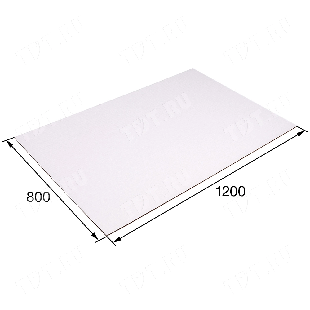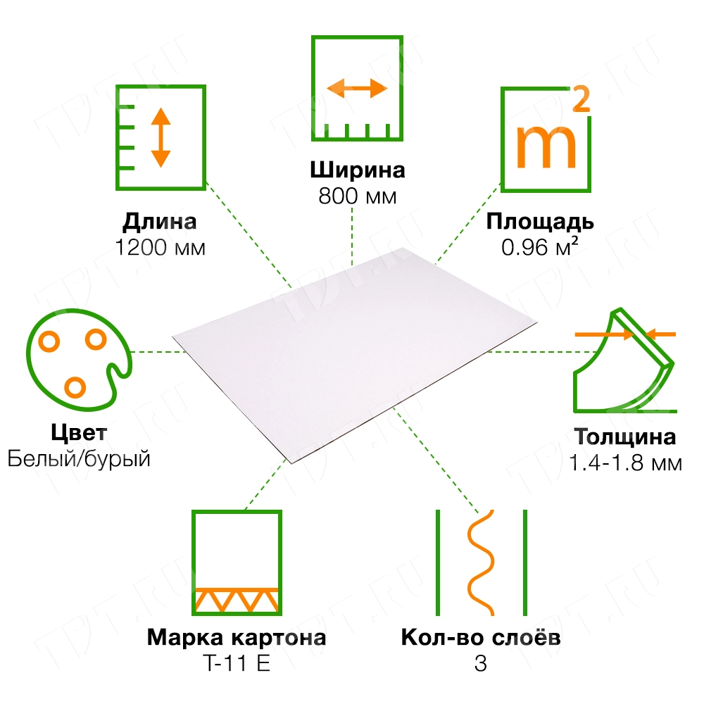 Трехслойный лист микрогофрокартона, бело-бурого цвета, марки T-11 Е, длиной 1200 мм, шириной 800 мм, толщиной 1.4-1.8 мм, площадью 0.96 м², направление волны вдоль стороны 1200 мм. Для производства листов используется только первичное высококачественное сырье. Производится в России.