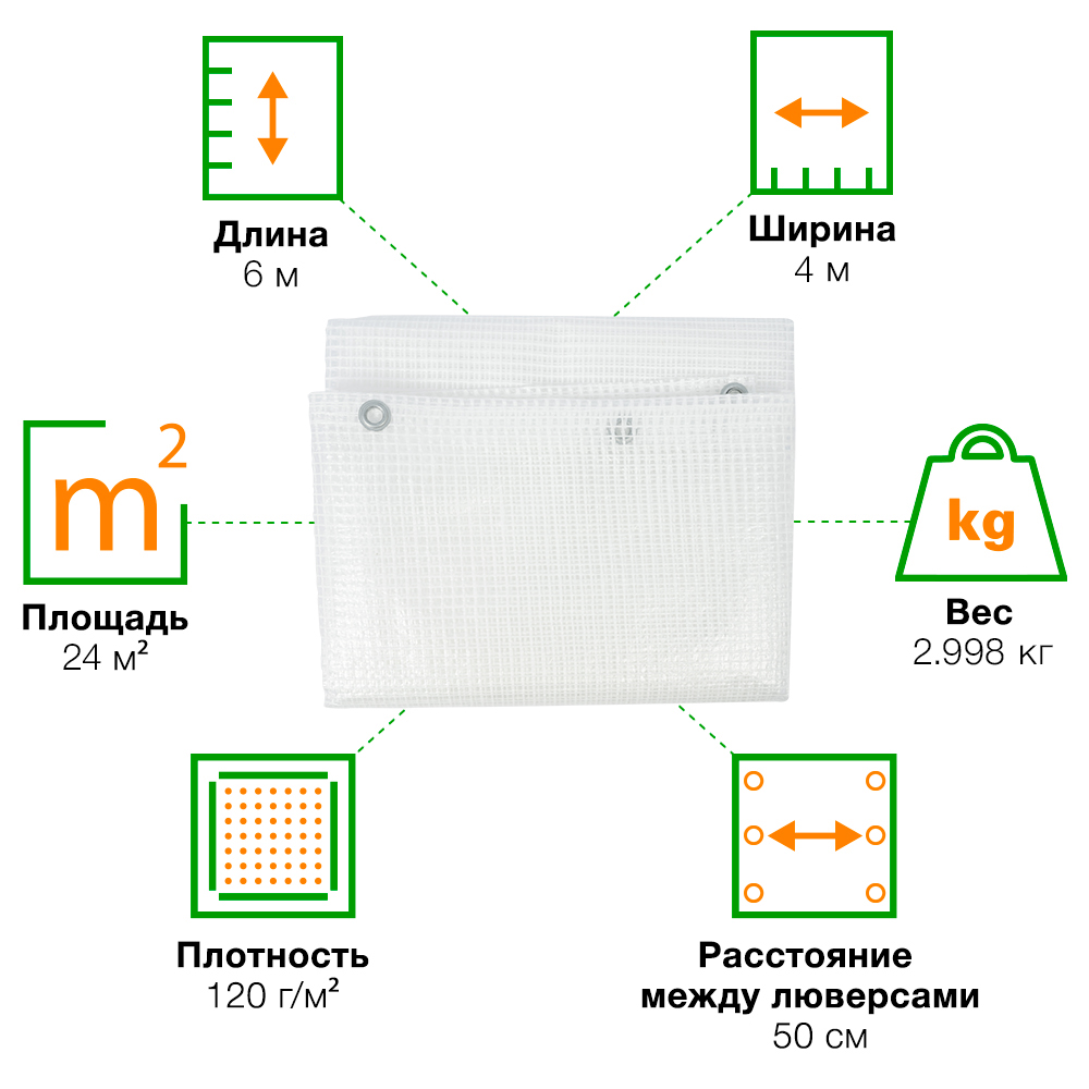Большой армированный тент с усиленными углами и люверсами длиной 6 м, шириной 4 м, площадью 24 м², плотностью 120 г/м². Полиэтиленовая пленка повышенной прочности, за счет сетки, создается усиление материала к растяжениям и разрывам. Имеет отличную проницаемость к солнечному свету, применяется для накрытия теплиц и растений на садовых участках.