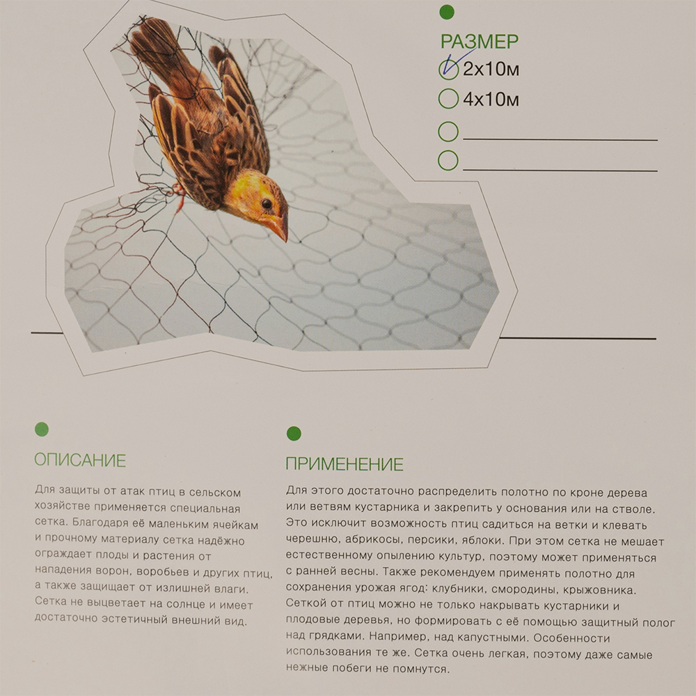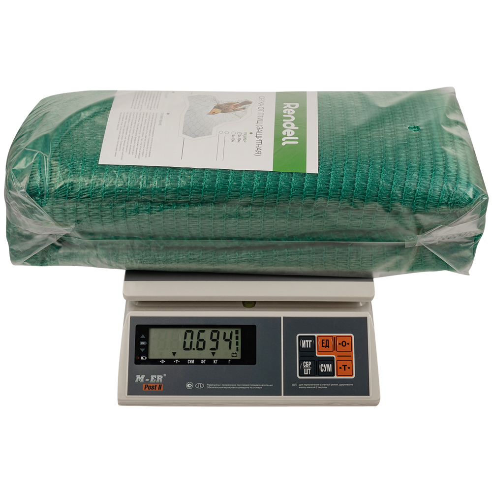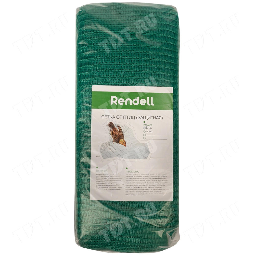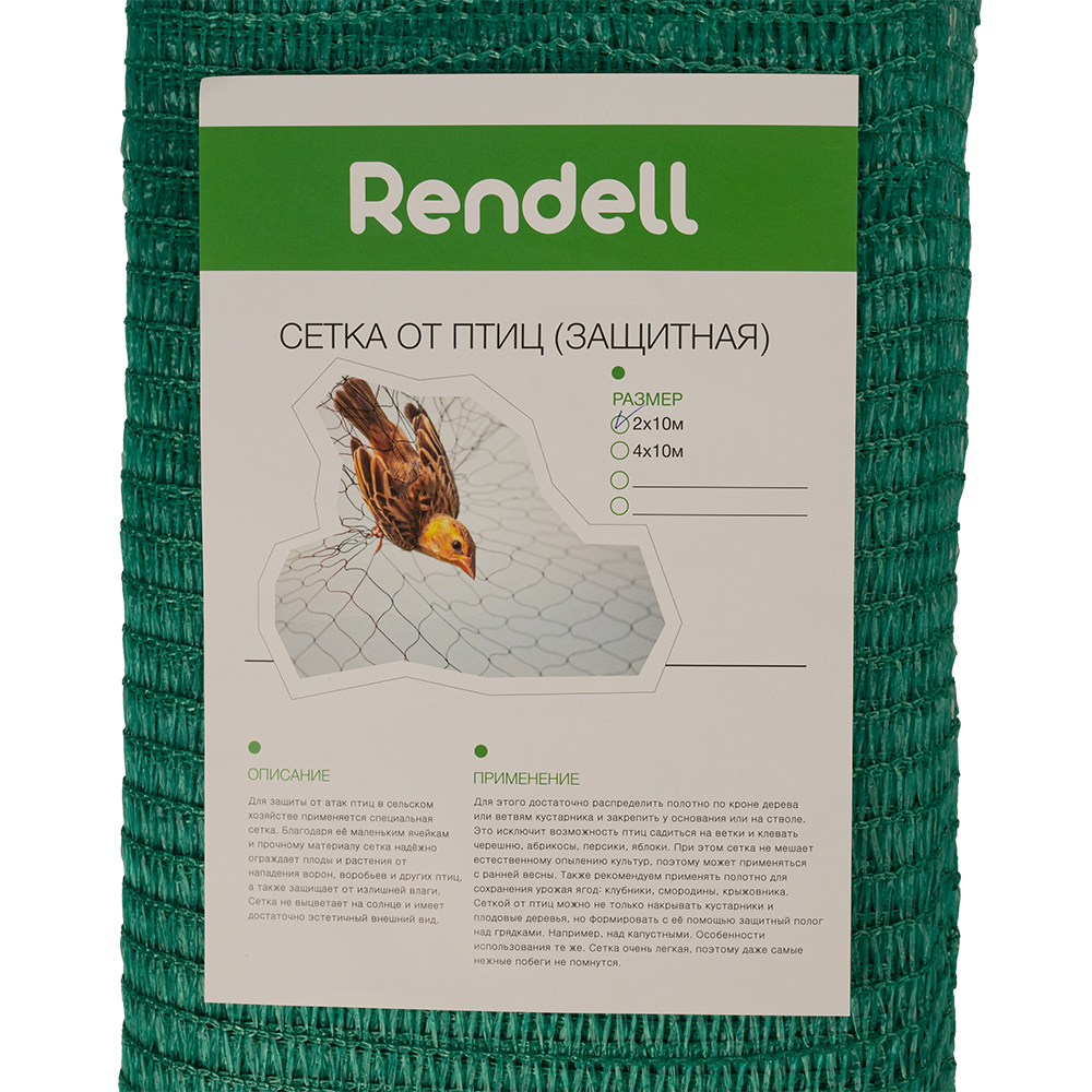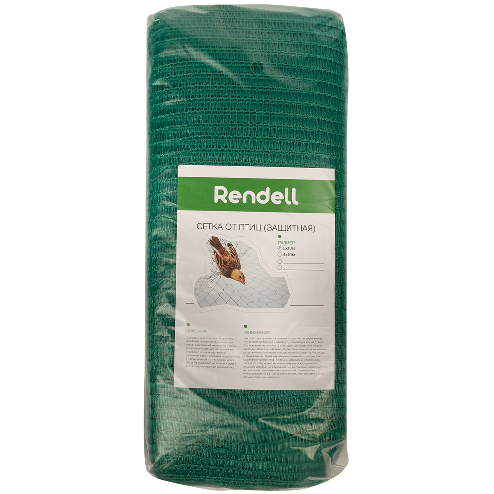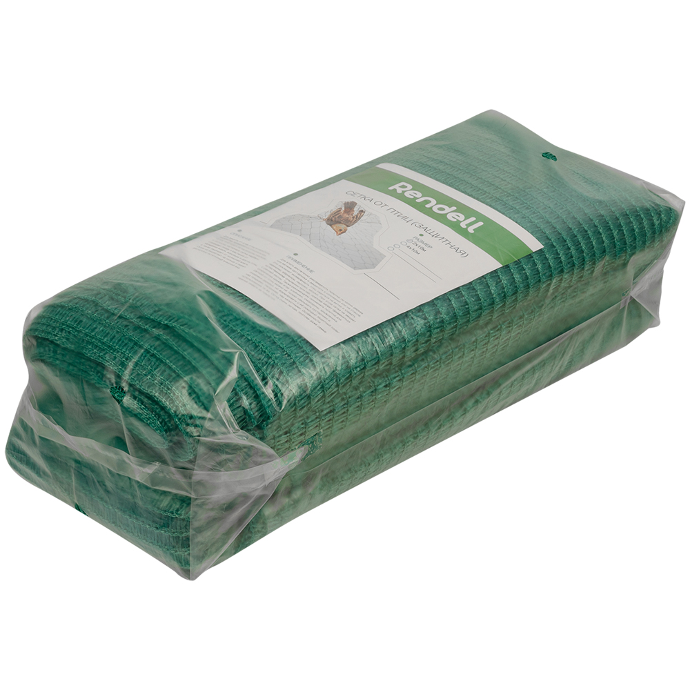 Зеленая фасадная сетка Rendell для защиты от птиц, длиной 10 м, шириной 2 м, площадью рулона 20 м², плотностью 35 г/м², размером ячейки 1.5*10 мм, затенением 35-40%, весом 694 г. Материал – HDPE. Производится в России.