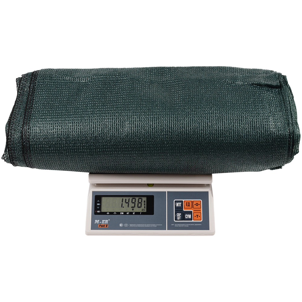 Темно-зеленая фасадная сетка Rendell PRO для строительных лесов, заборов, длиной 10 м, шириной 2 м, площадью рулона 20 м², плотностью 80 г/м², размером ячейки 1*7 мм, затенением 80-85%, весом 1.65 кг. Материал – HDPE. Производится в России.