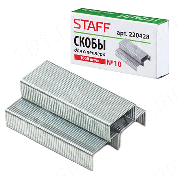 Скобы STAFF для степлера №10, в упаковке по 1000 штук, сшивают до 20 листов бумаги, серебристого цвета, код производителя 220428, размером 10 мм. Материал – сталь с цинковым покрытием. Производится в Китае.