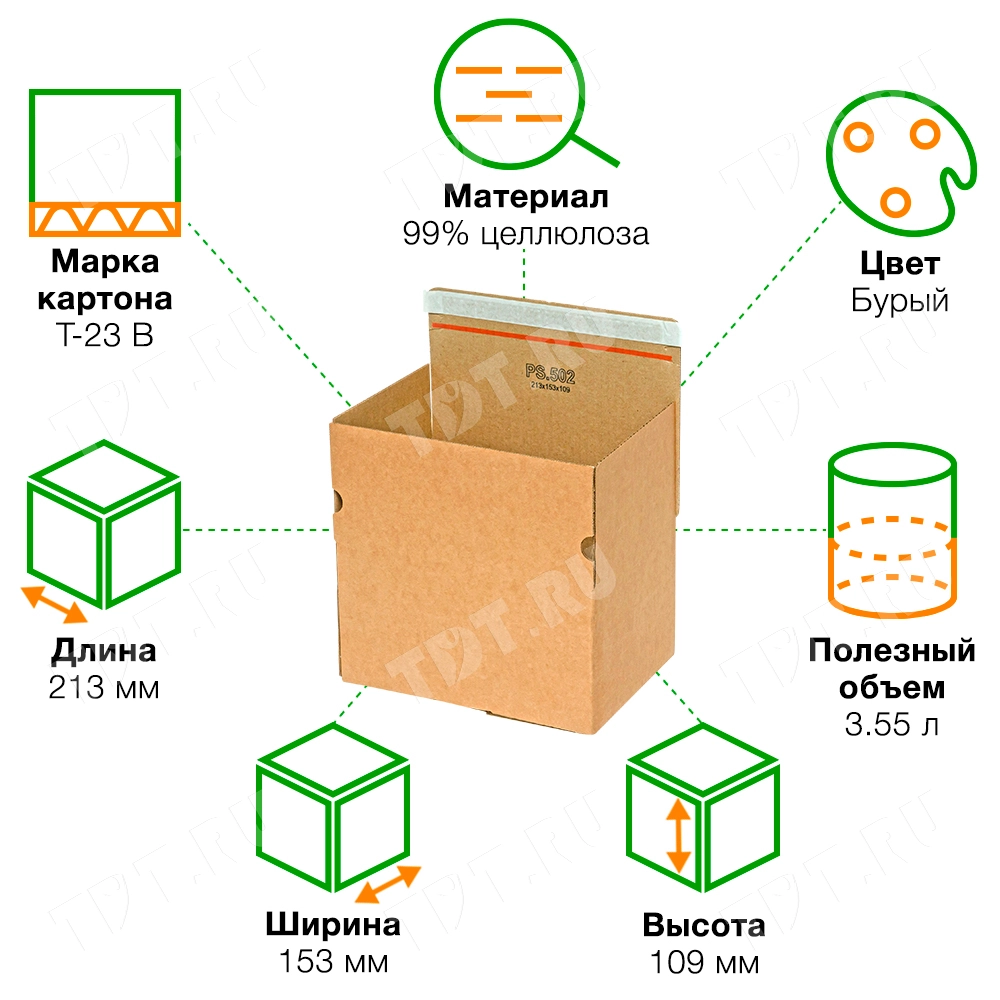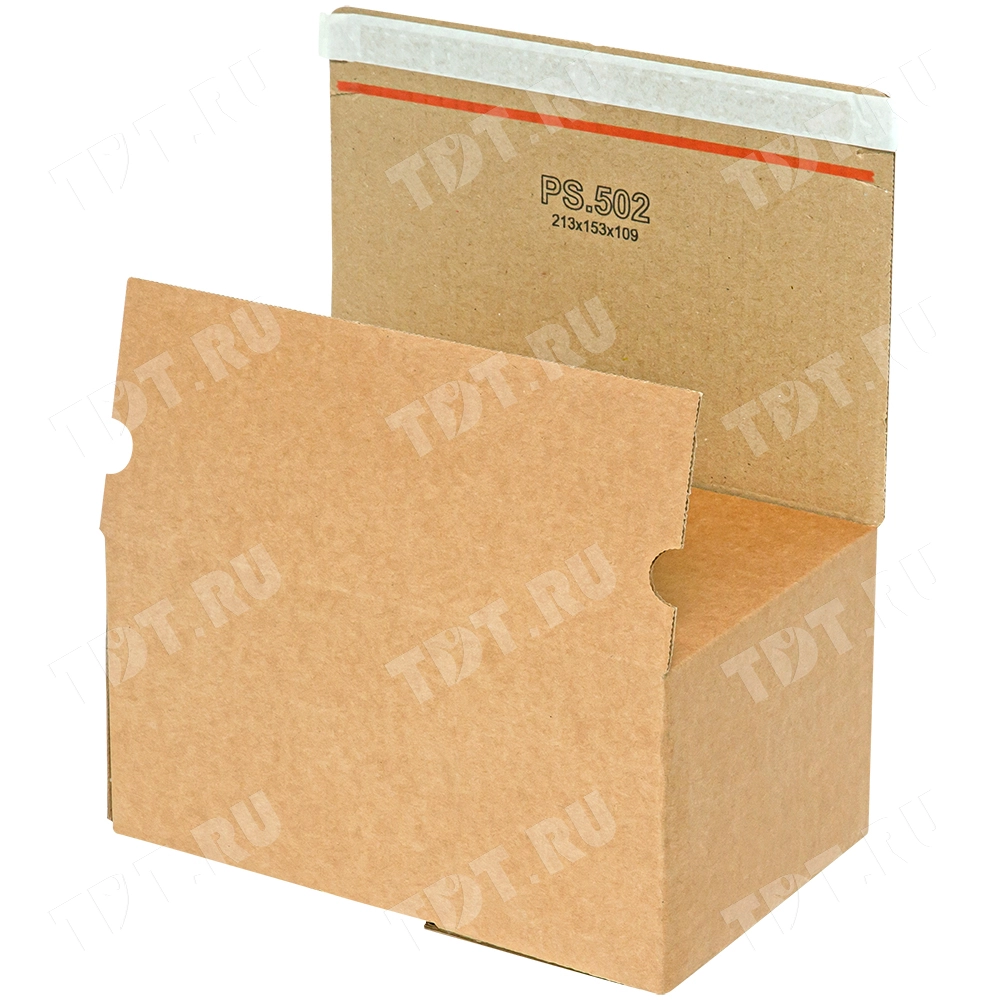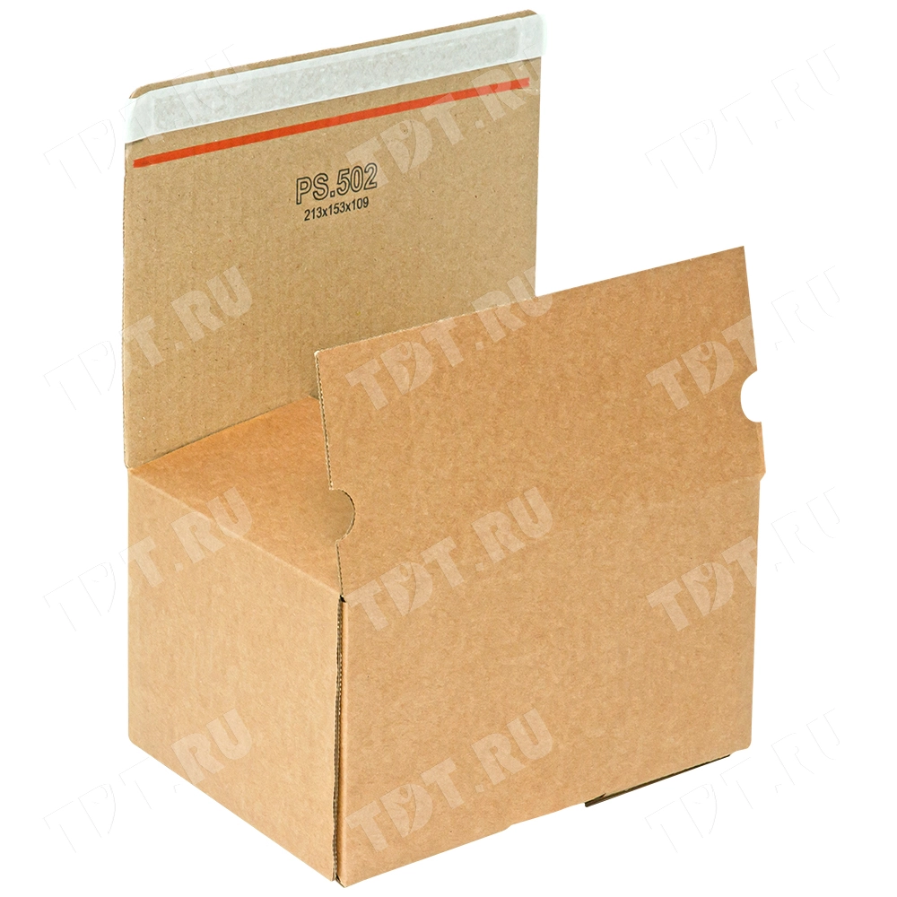 Почтовый короб PS.502 с клеевым клапаном, бурого цвета, длиной 231 мм, шириной 153 мм и высотой 109 мм. Изготовлен из трёхслойного гофрокартона Т-23 В. Полезный объём — 3.55 л.
