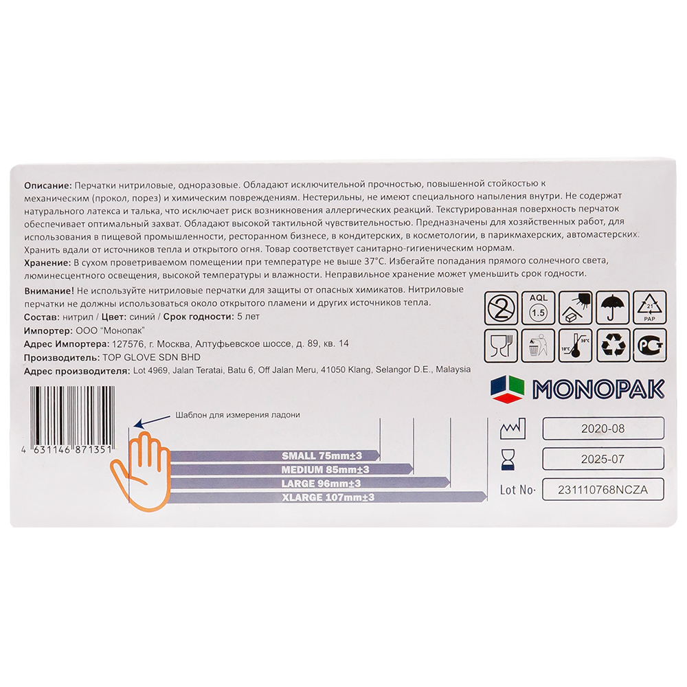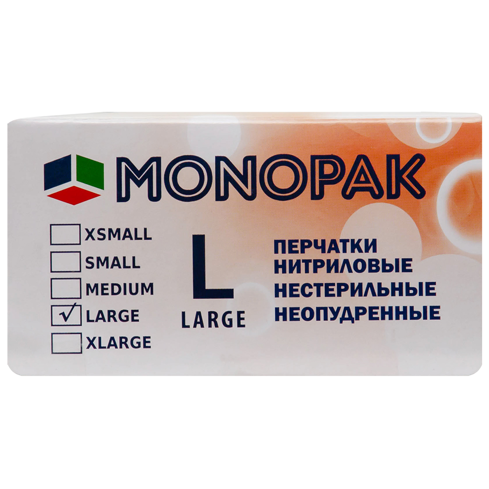 Перчатки бытовые нитриловые Monopak размера L, неопудренные, нестерильные, голубого цвета, в упаковке по 100 штук. Материал – 100% нитрил (синтетический латекс). Обладают прочностью, повышенной стойкостью к механическим (порезы и проколы) и химическим (углеводородов, масел и жиров.) повреждениям. Не имеют специального напыления внутри. Не содержат натурального латекса и талька, что исключает риск аллергических реакций. Текстурированная поверхность перчаток обеспечивает оптимальный захват. Обладают высокой тактильной чувствительностью. Производятся в Малайзии.