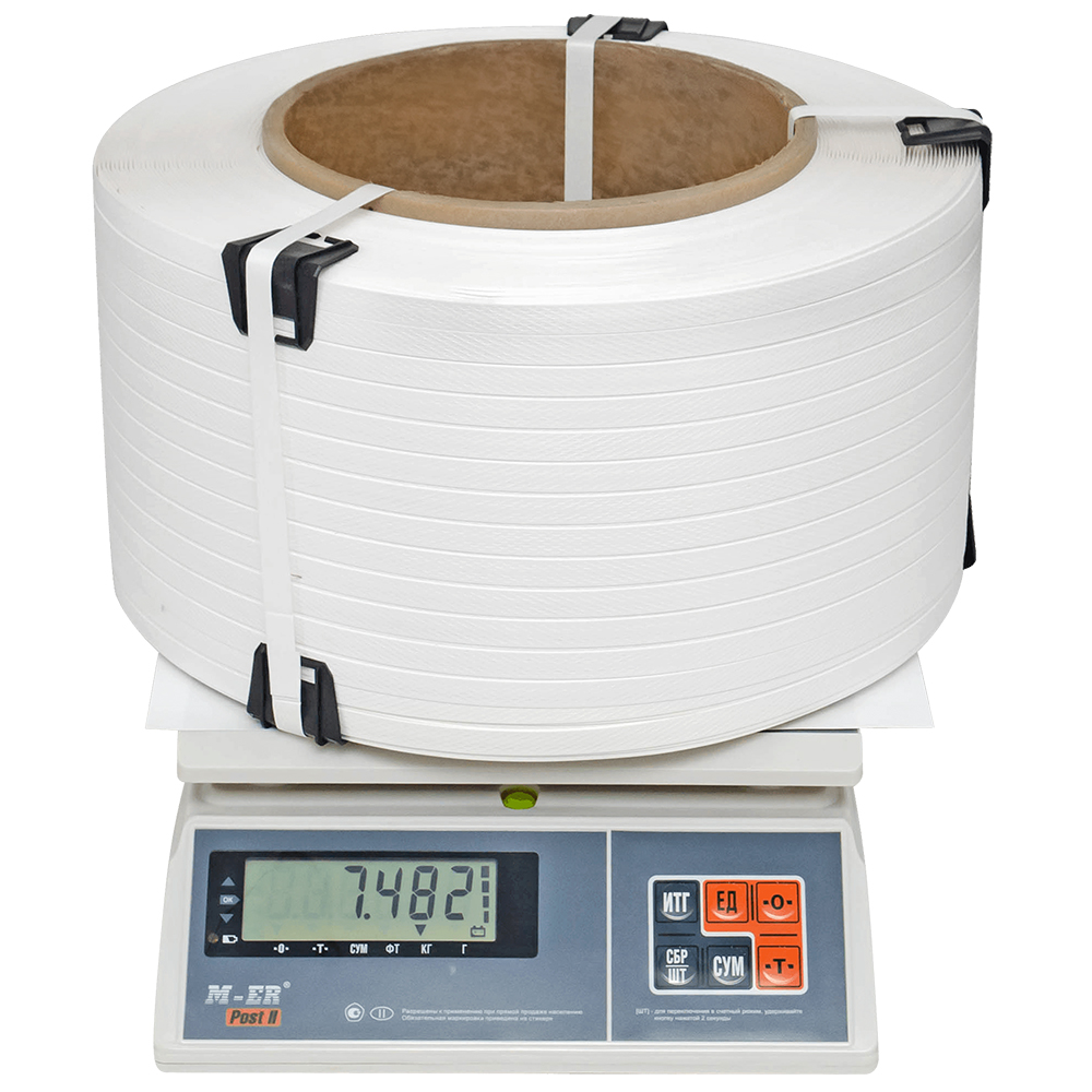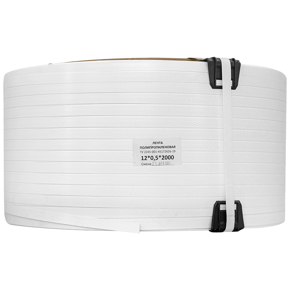 Упаковочная полипропиленовая лента (ПП) Лентапром, белого цвета, намоткой 2000 м, шириной 12 мм, толщиной 0,5 мм, усилием на разрыв 120 кГс, весом 7.482 кг, транспортировочным объемом 0.020808 м³. Диапазон рабочих температур от -30 до +60°C. Производится в России.