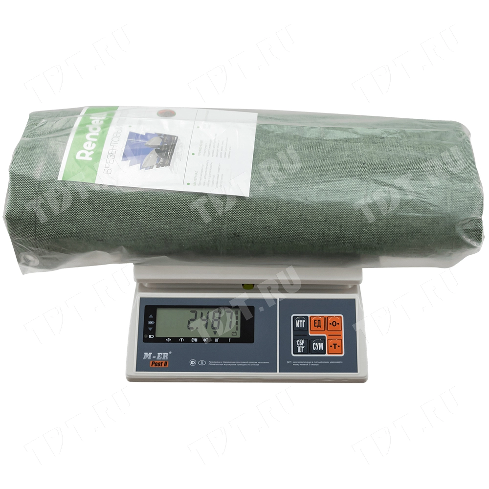 Огнеупорный брезент с люверсами Rendell, цвета хаки, длиной 3 м, шириной 2 м, площадью 6 м², плотностью 400 г/м², расстоянием между люверсами 50 см, весом 2.487 кг. Материал – хлопок, лен и огнеупорная пропитка (ОП). Производится в России.