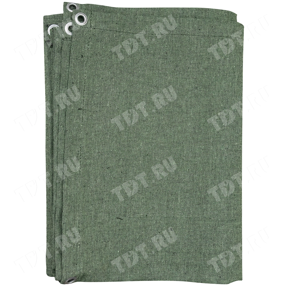 Огнеупорный брезент с люверсами Rendell, цвета хаки, длиной 5 м, шириной 3 м, площадью 15 м², плотностью 400 г/м², расстоянием между люверсами 50 см, весом 6 кг. Материал – хлопок, лен и огнеупорная пропитка (ОП). Производится в России.