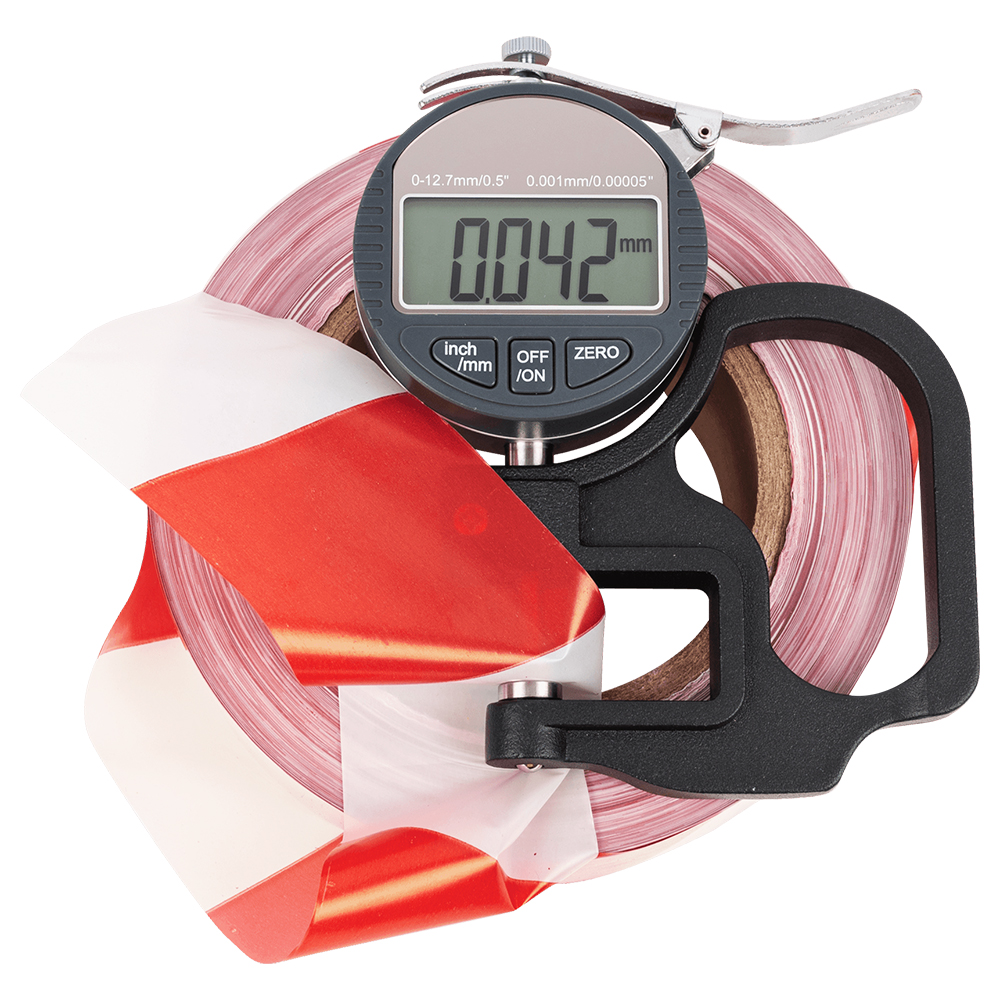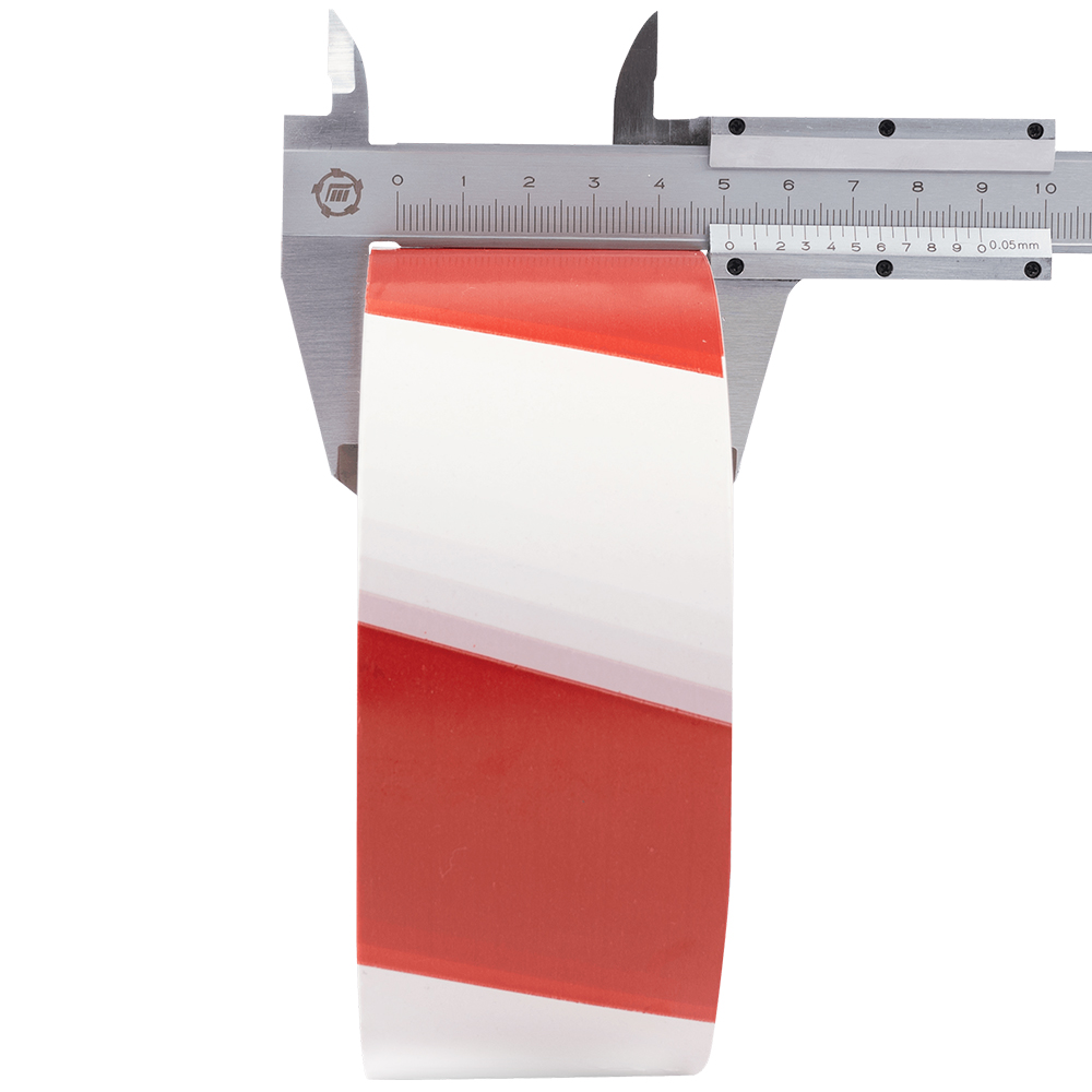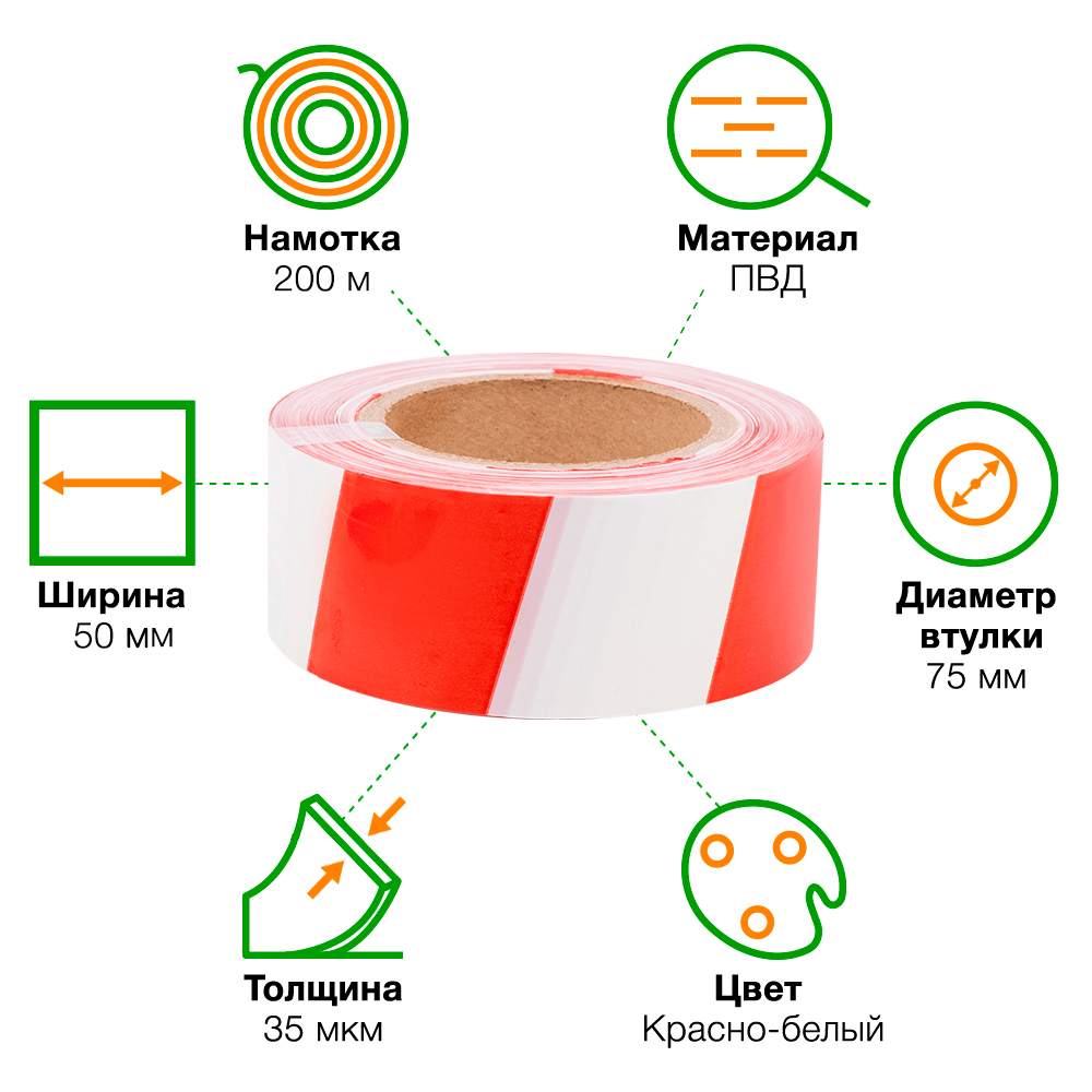 Бесклеевая сигнальная лента, красно-белого цвета, шириной 50 мм, толщиной 35 мкм, намоткой 200 мм. Материал – полиэтилен высокого давления (ПВД). Производится в России.