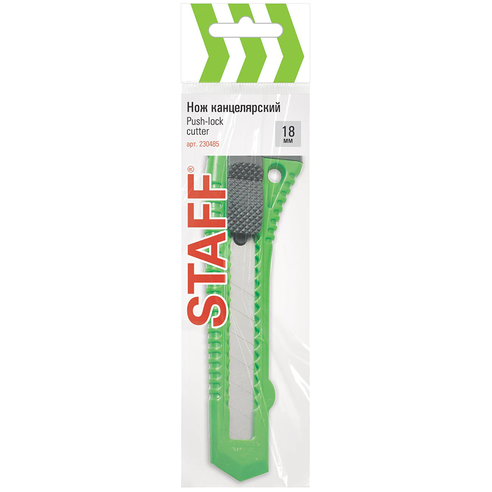 Нож канцелярский STAFF с отламываемым лезвием, код производителя 230485, Push-lock cutter, шириной 18 мм. Материал – пластик. Производится в Китае.