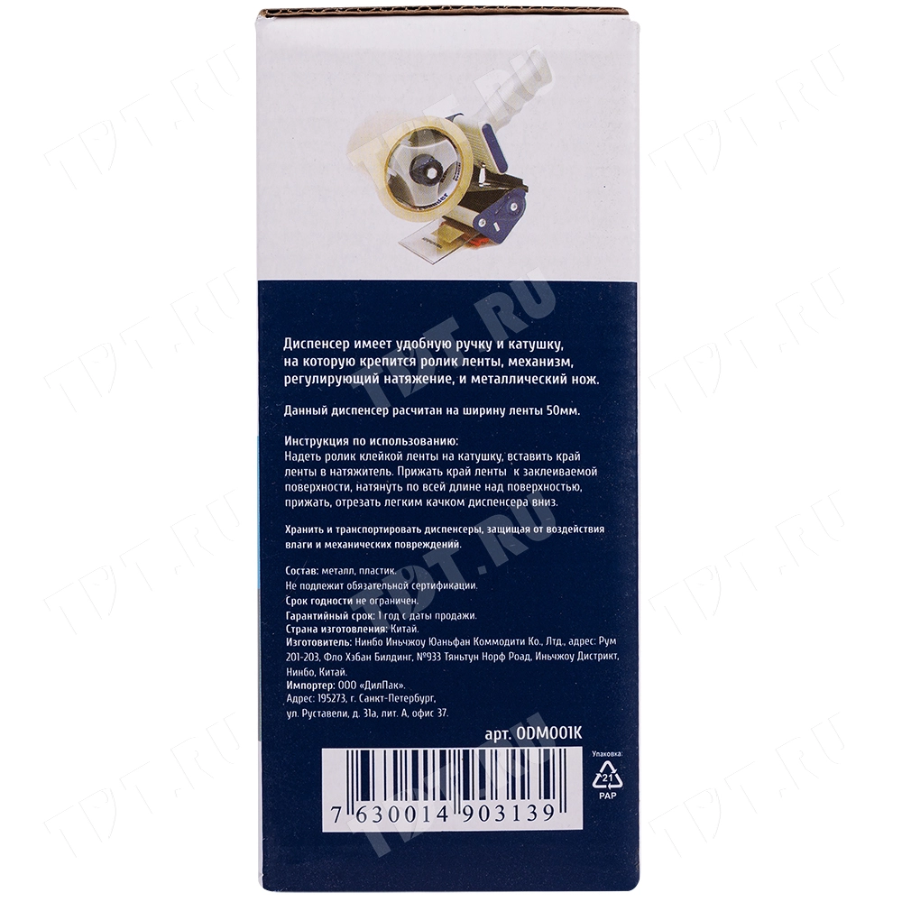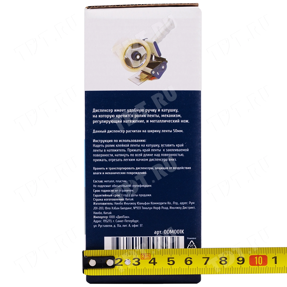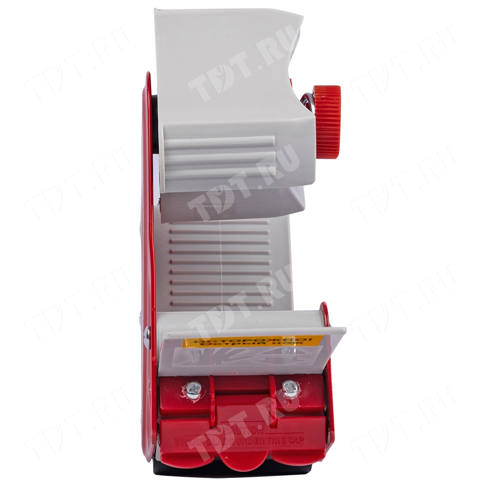 Диспенсер имеет удобную ручку и катушку, на которую крепится ролик ленты, механизм, регулирующий натяжение, и металлический нож.