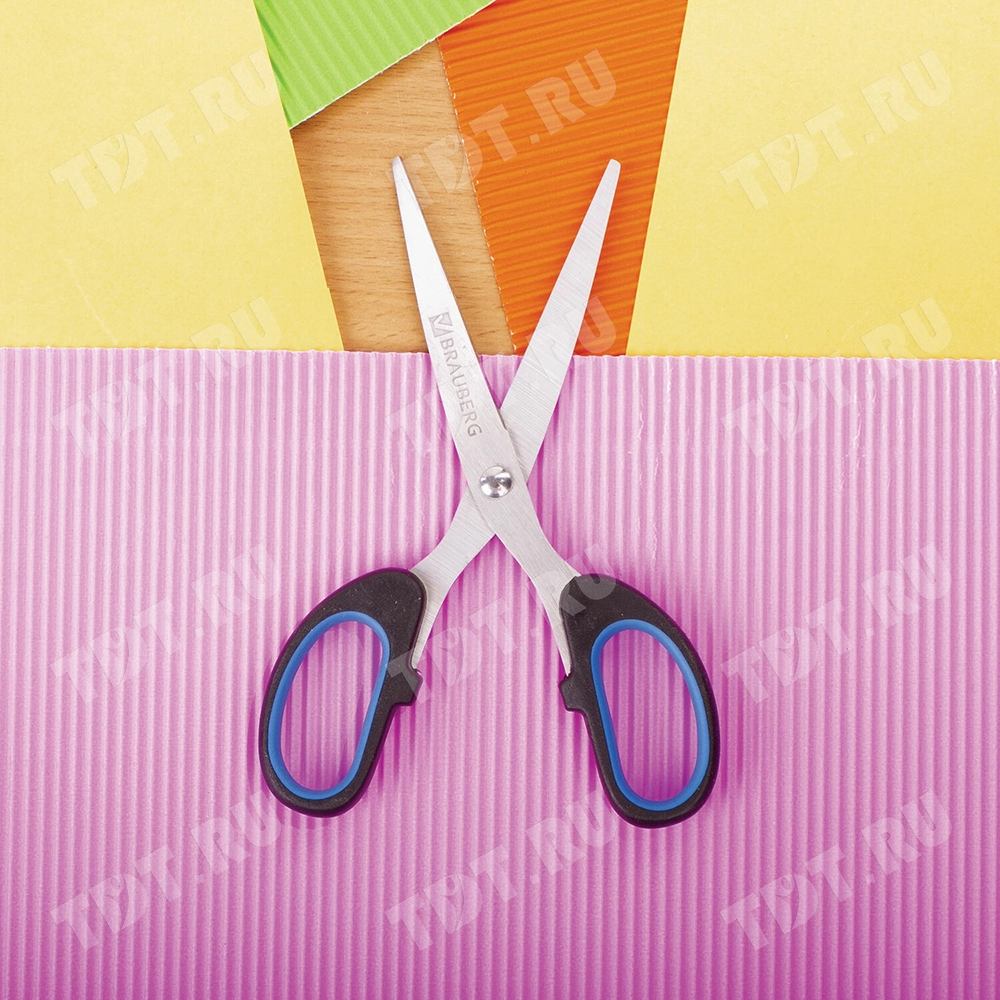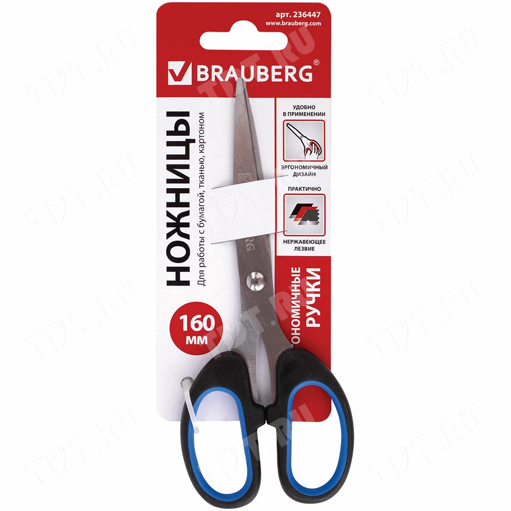 Универсальные ножницы Brauberg «CLASSIC+», код производителя 236447, длина лезвий 160 мм, черно-синего цвета. Материал – нержавеющая сталь. Продаются в картонной упаковке с европодвесом. Производятся в Китае.