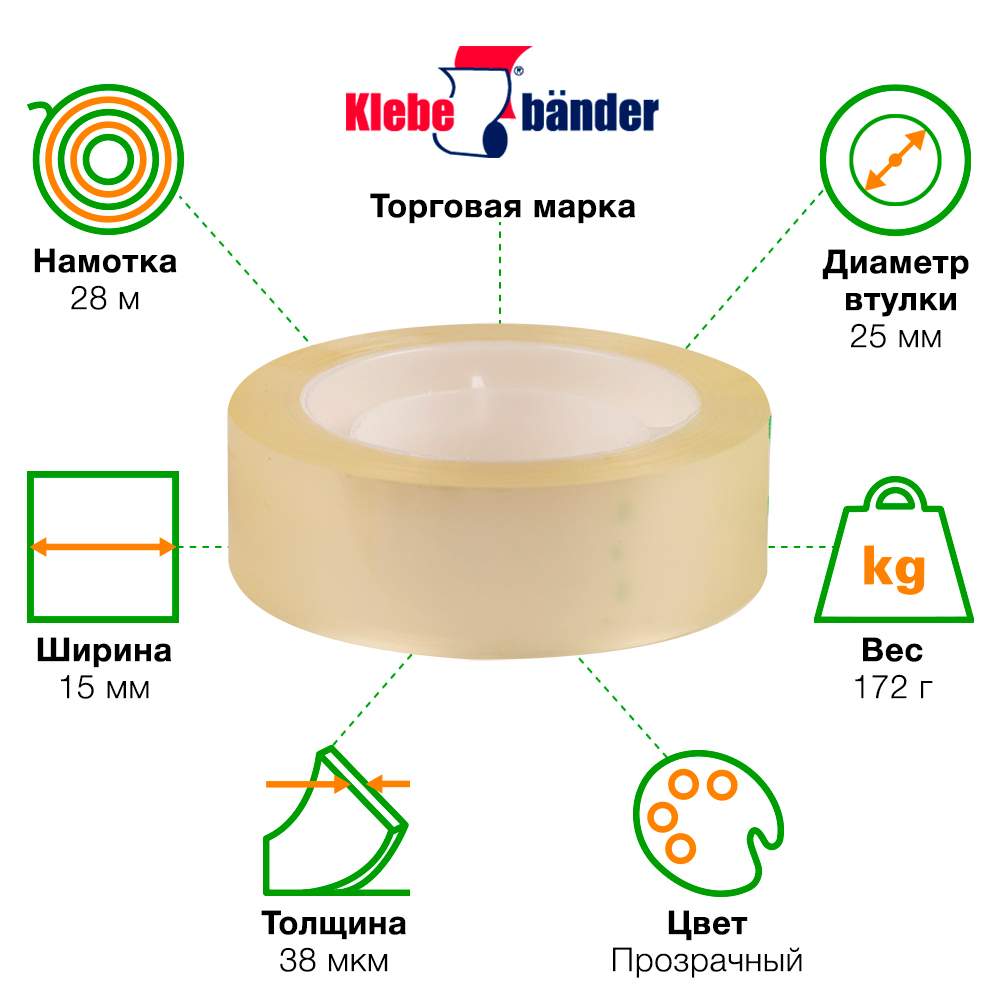 Канцелярская прозрачная клейкая лента Klebebander шириной 15 мм, диаметром втулки 25 мм, намоткой 28 метров. Изготовлена на основе биаксиально ориентированной полипропиленовой пленки (БОПП).