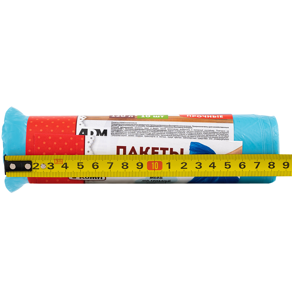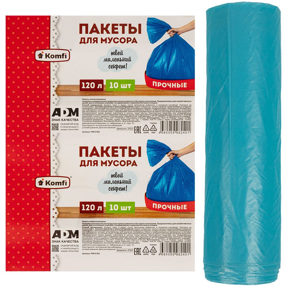 Мешки для мусора Komfi ПНД, код производителя 17176, голубого цвета, объемом 120 л, длиной 100 см, шириной 70 см, толщиной 14 мкм, в упаковке по 10 штук. Изготовлены из полиэтилена низкого давления (ПНД).