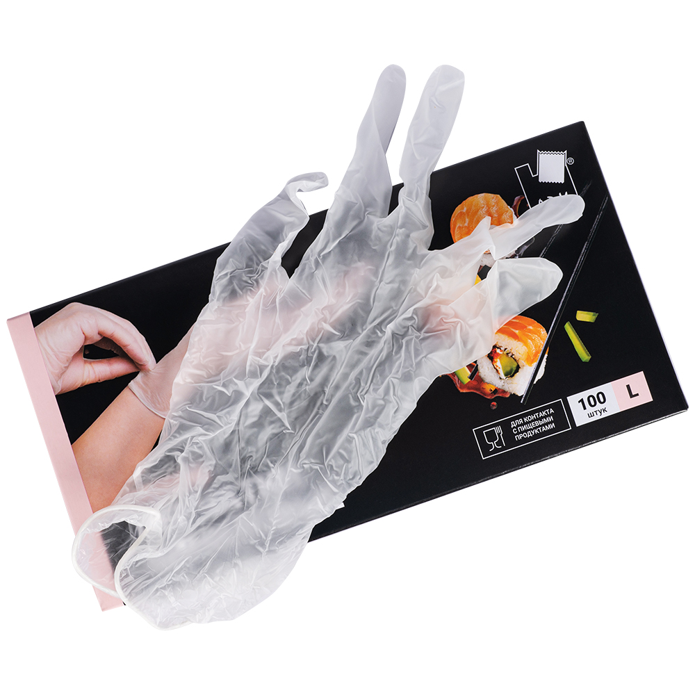 Одноразовые виниловые перчатки A.D.M., размер L, белого цвета, неопудренные, нестерильные, в упаковке по 100 шт. Предназначены для защиты рук при уборке, приготовлении пищи, косметических процедурах. Материал – поливинилхлорид. Производятся в Китае.