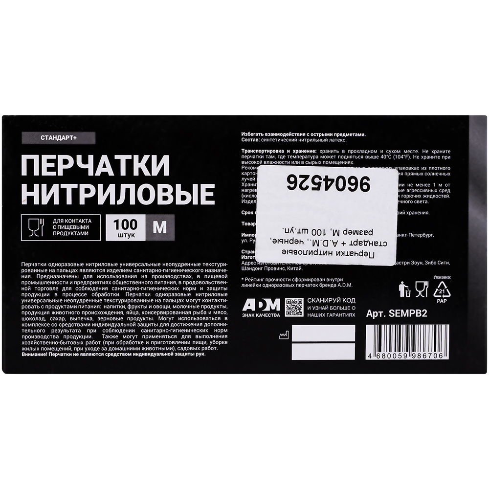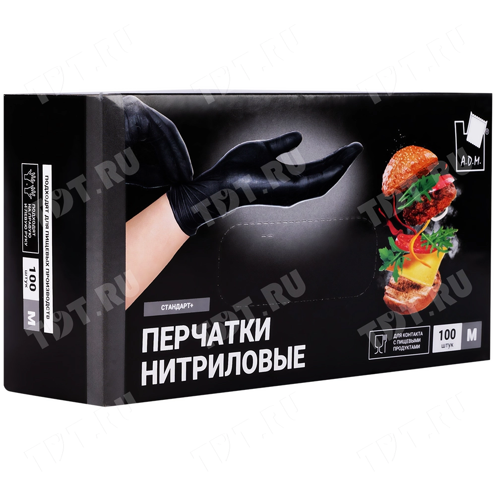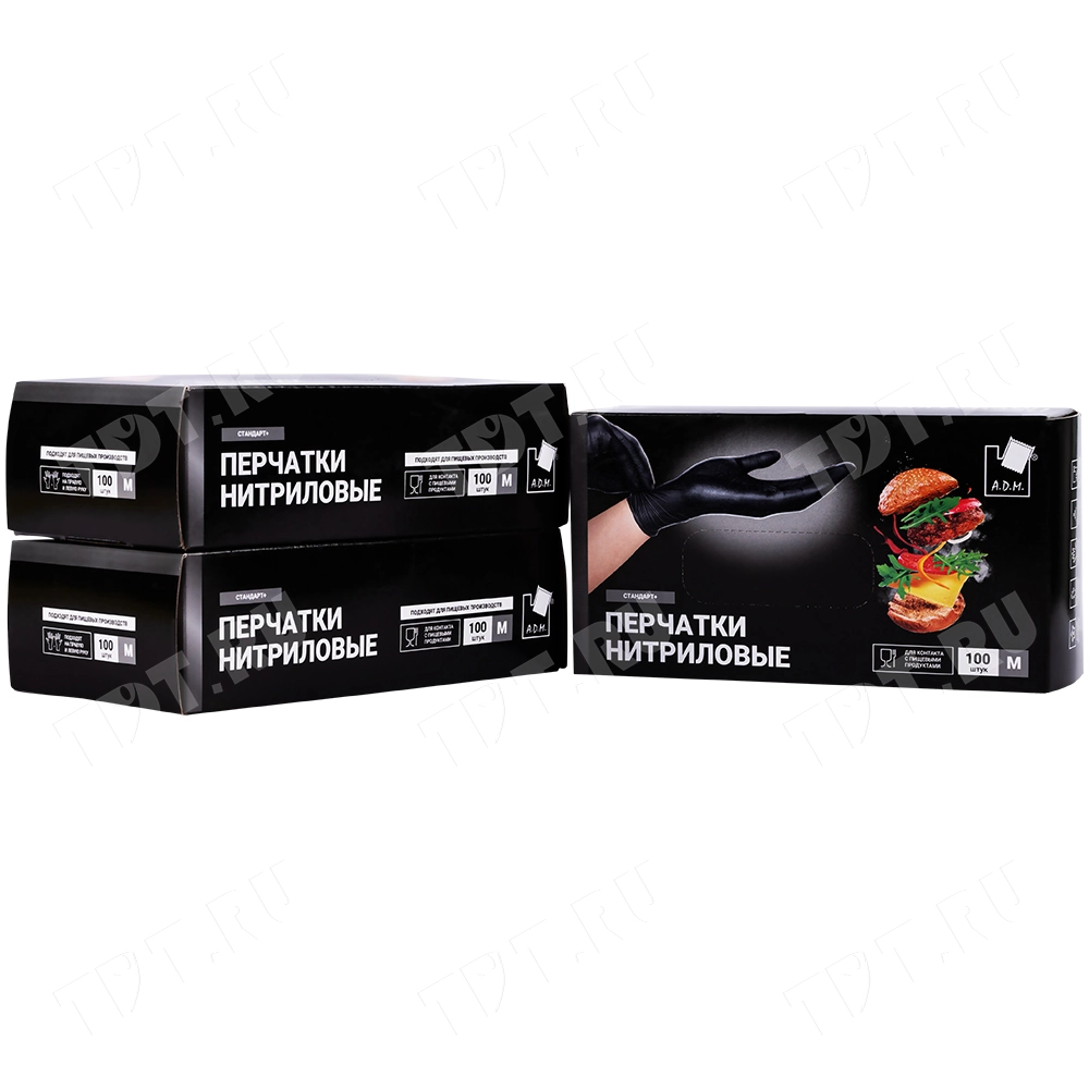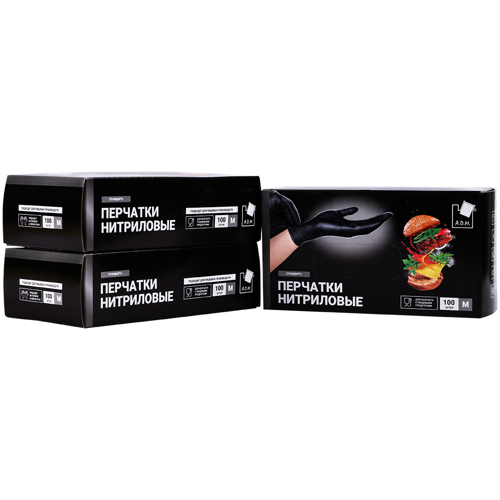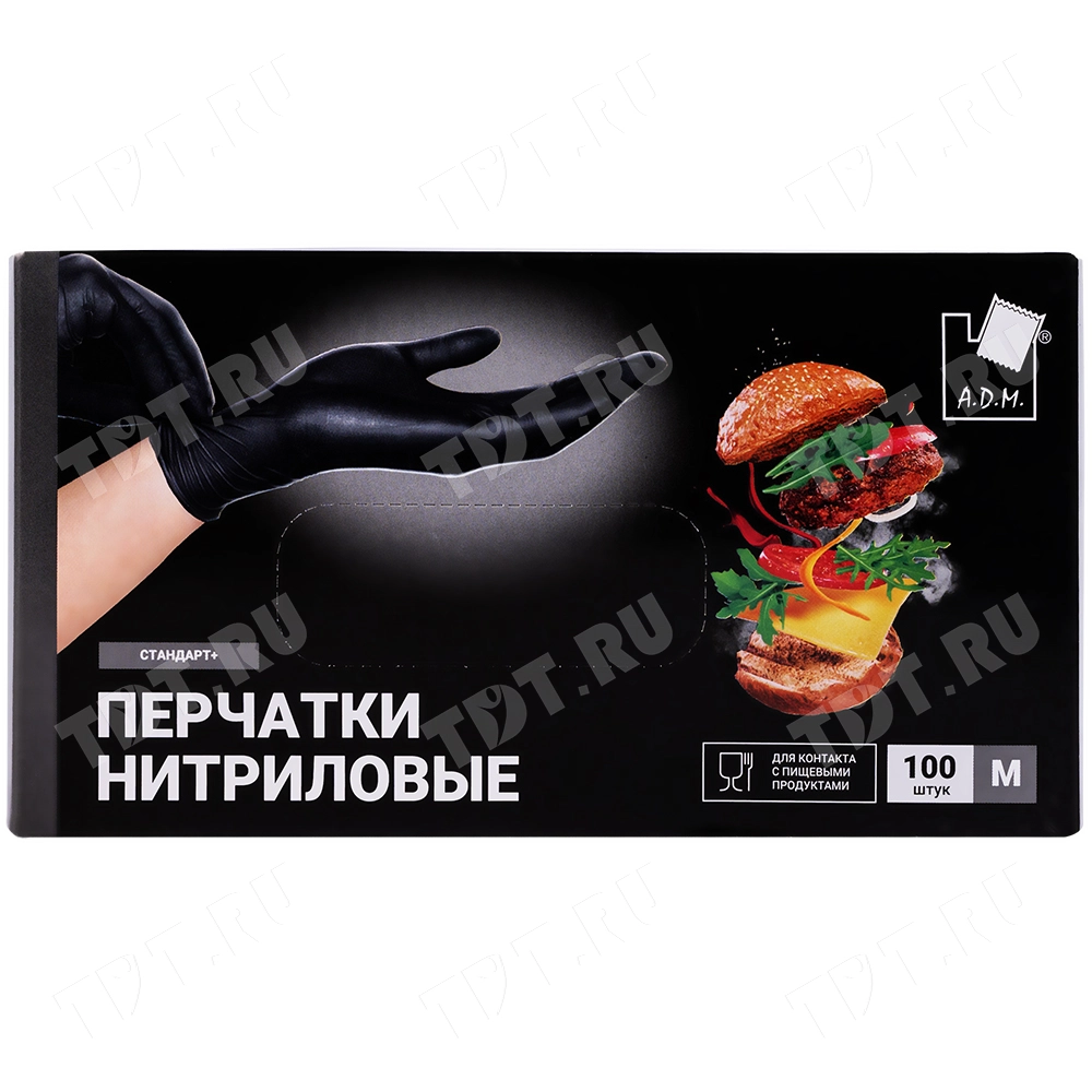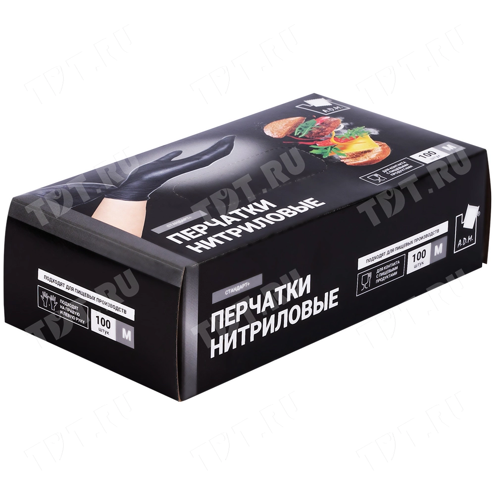 Одноразовые нитриловые перчатки Стандарт+ A.D.M., размера М, черного цвета, в упаковке по 100 шт. Материал – нитрил. Производятся в Китае.