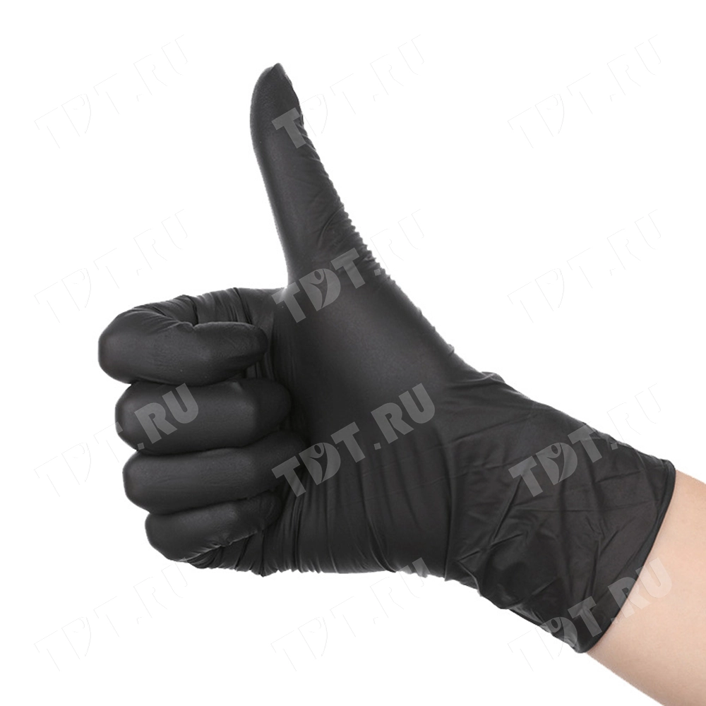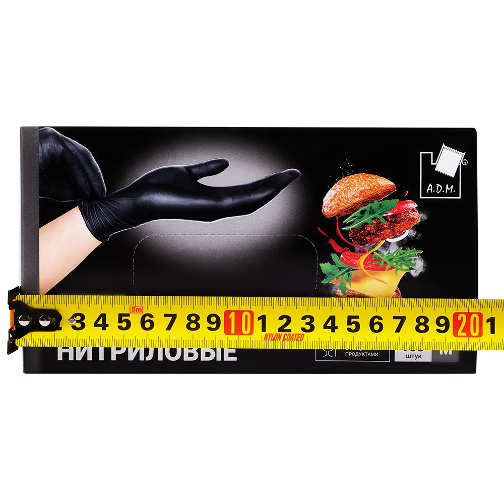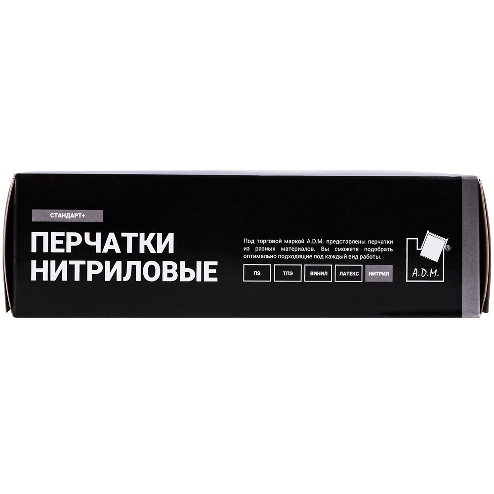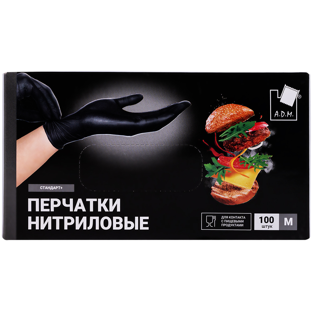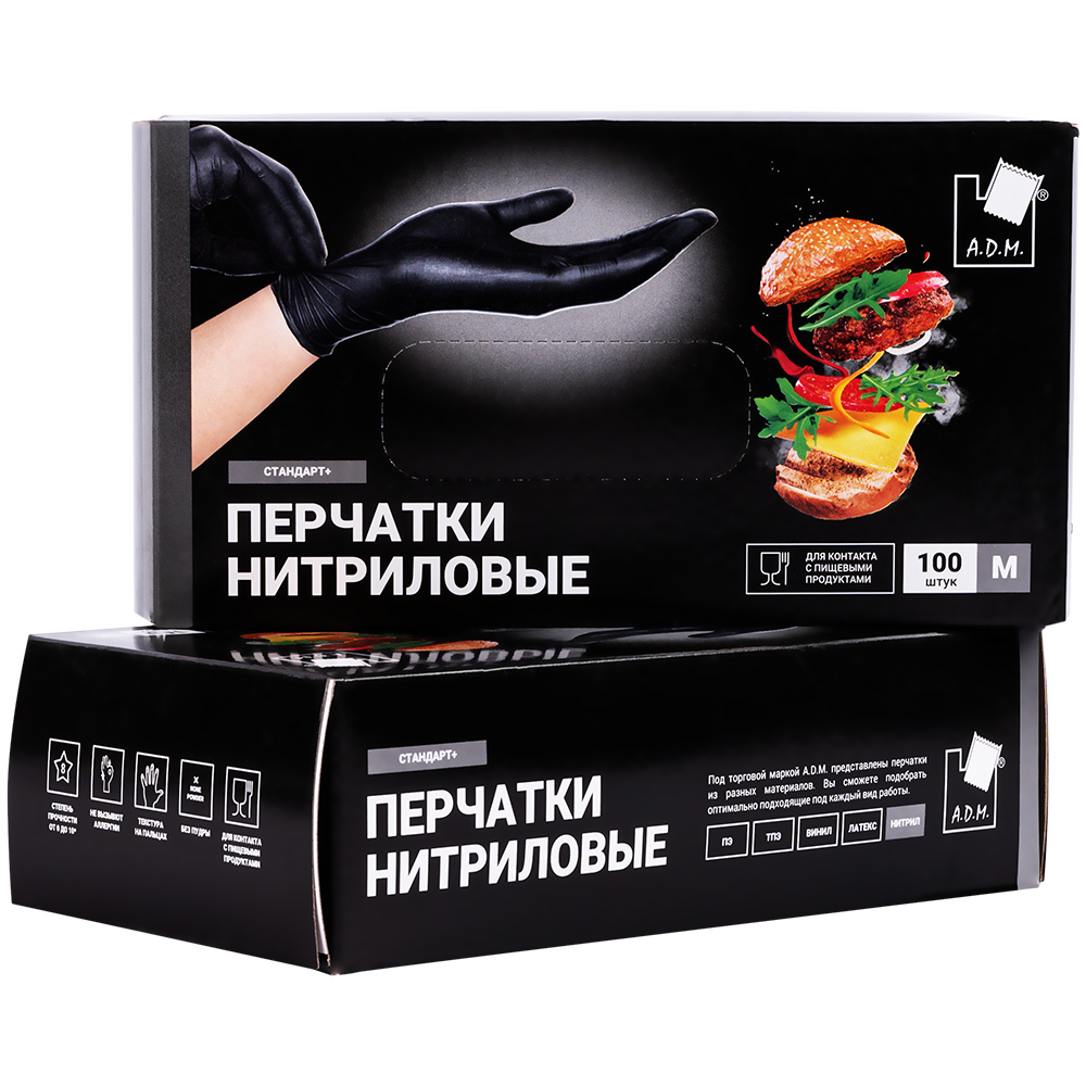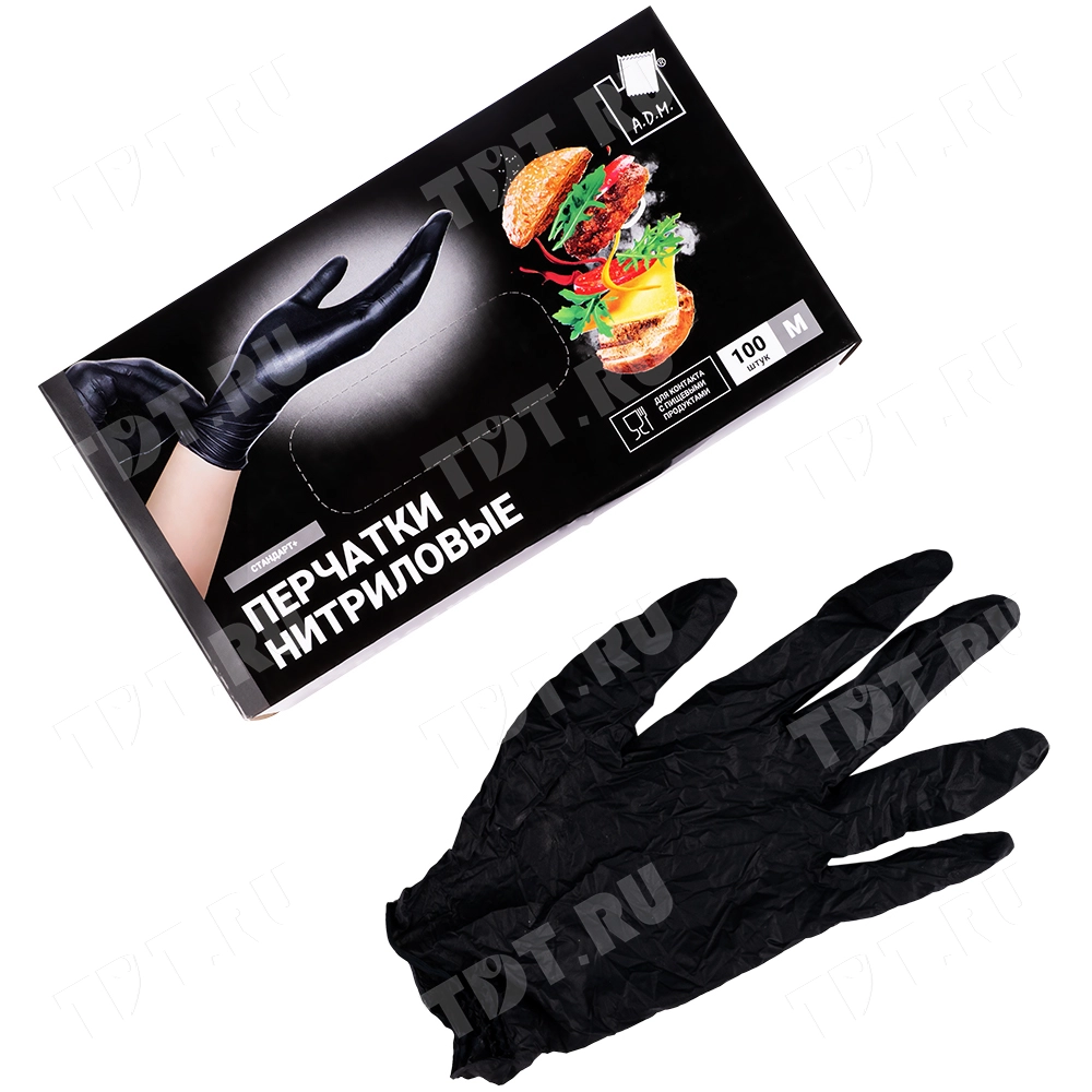 Одноразовые нитриловые перчатки Стандарт+ A.D.M., размера М, черного цвета, в упаковке по 100 шт. Материал – нитрил. Производятся в Китае.