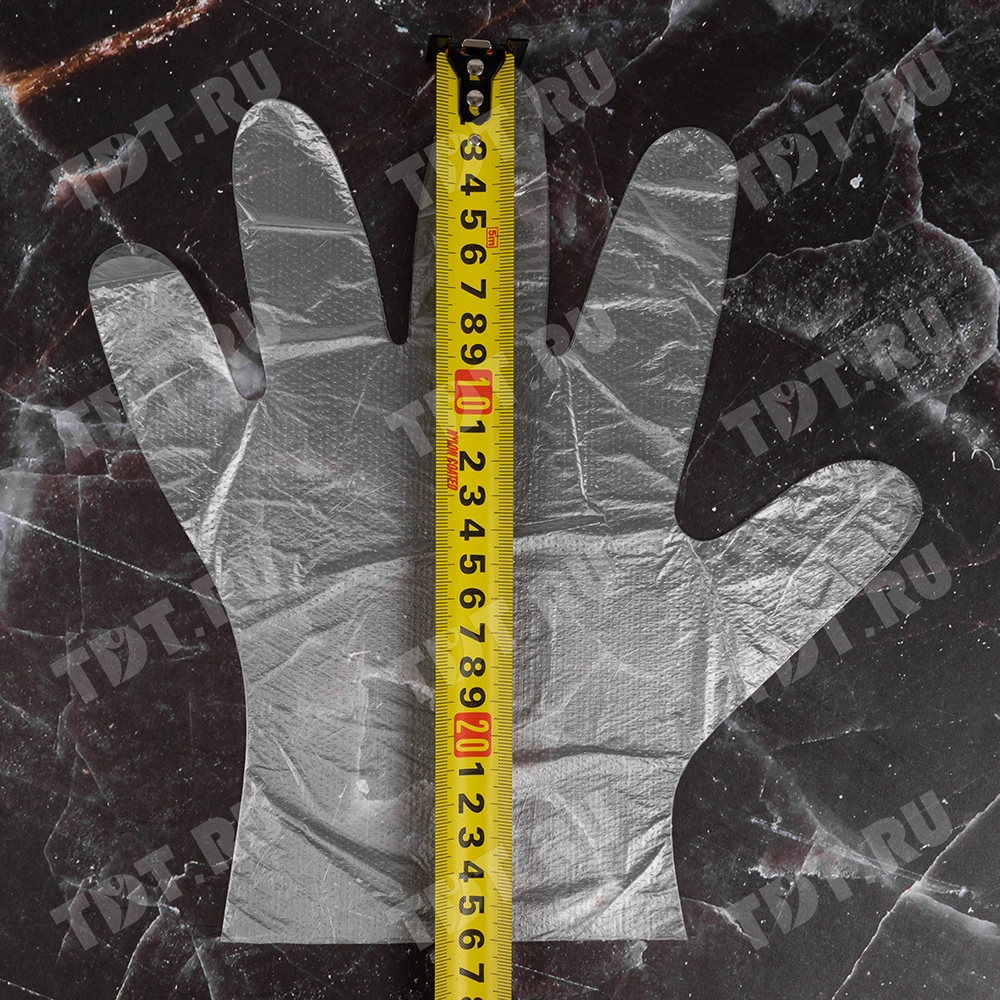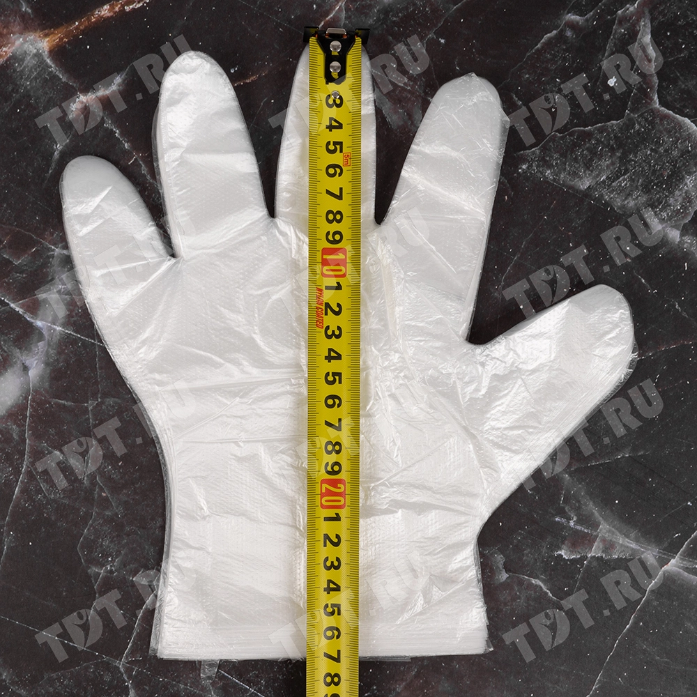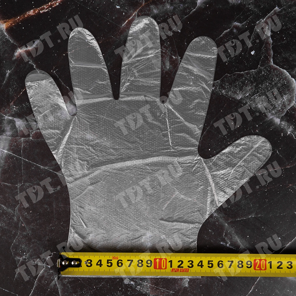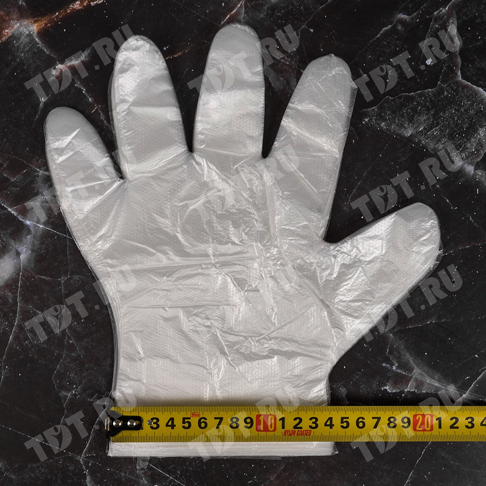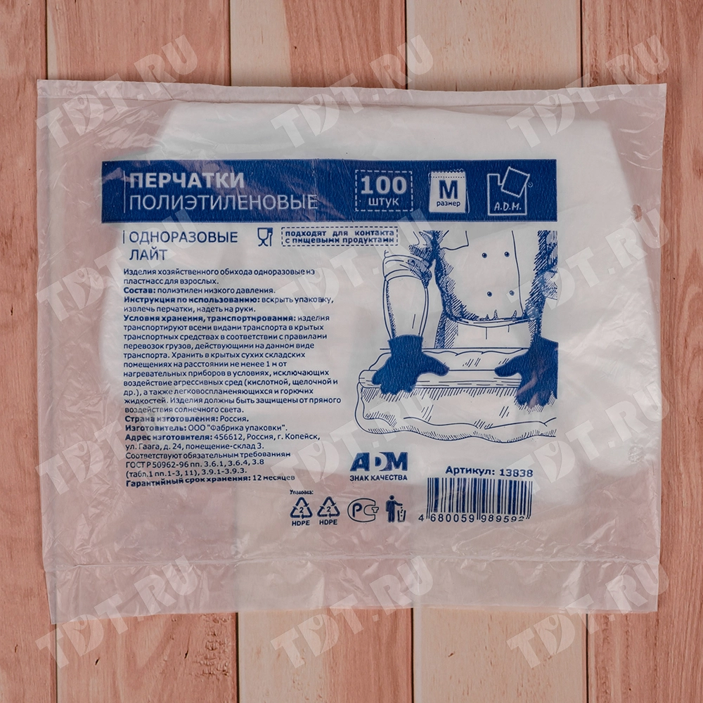 Одноразовые полиэтиленовые перчатки A.D.M., Лайт, размера M, неопудренные, прозрачного цвета, в упаковке по 100 штук. Материал – 100% полиэтилен. Производятся в России.