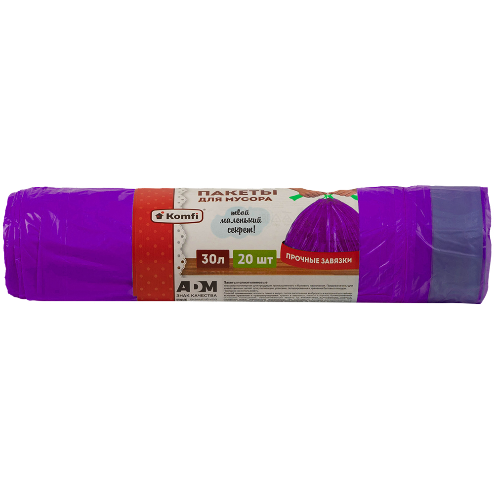 Мешки для мусора Komfi ПНД с прочными завязками, код производителя 30471, фиолетового цвета, объемом 30 л, длиной 58 см, шириной 48 см, толщиной 10 мкм, в упаковке по 20 штук. Выдерживают вес груза до 9 кг. Изготовлены из полиэтилена низкого давления (ПНД).