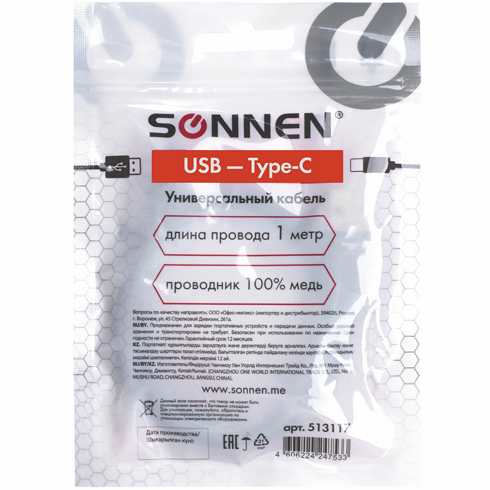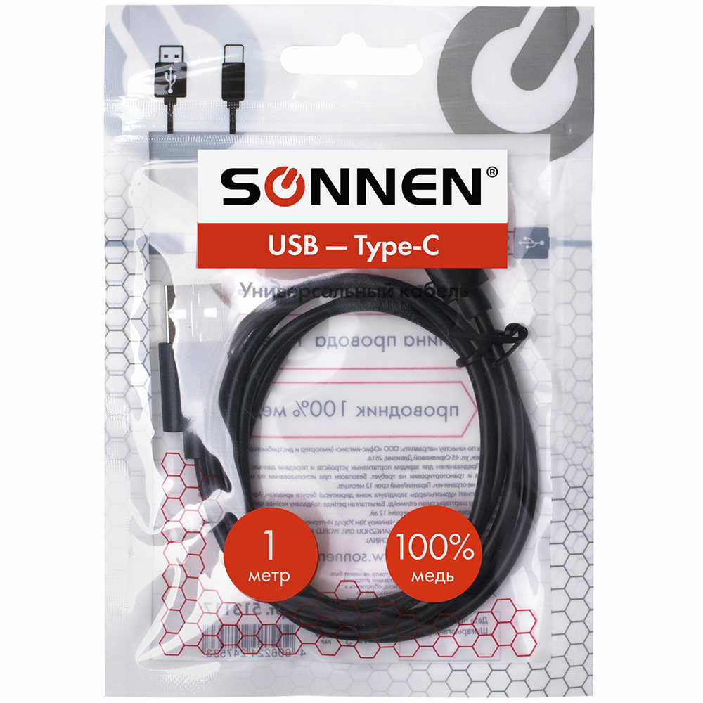 Кабель USB 2.0-Type-C, SONNEN черного цвета, длина кабеля 1 м, скорость передачи данных до 480 Мбит/с. Проводник 100% медь. Размер в упаковке: 0.7*15*10.7 см. Вес в упаковке: 29 г. Производится в Китае.