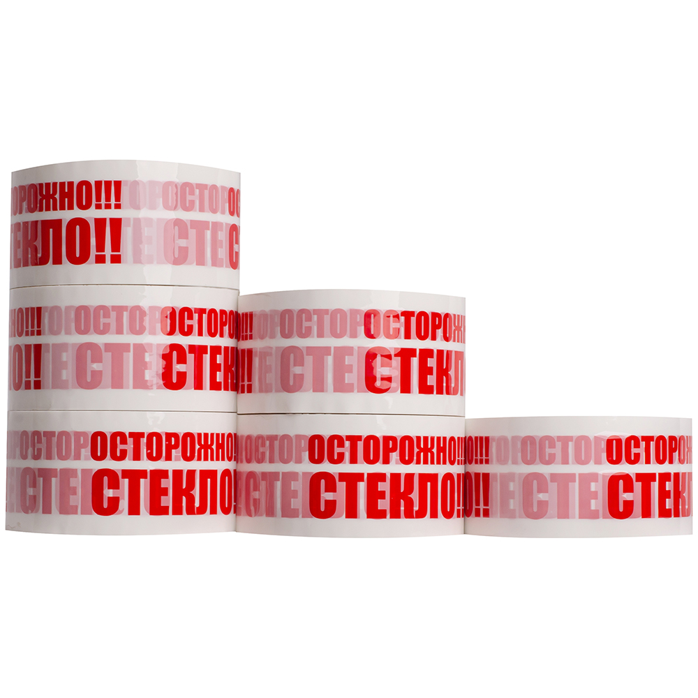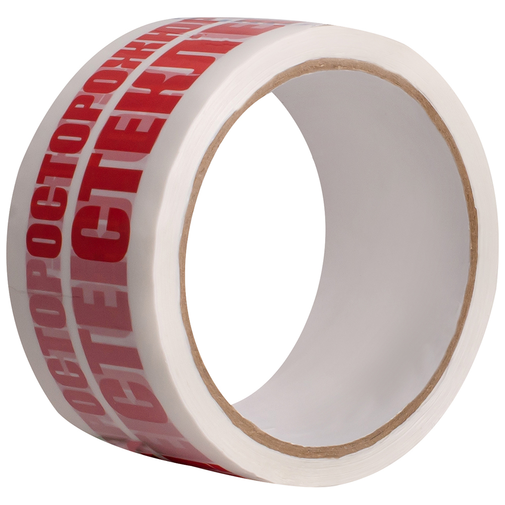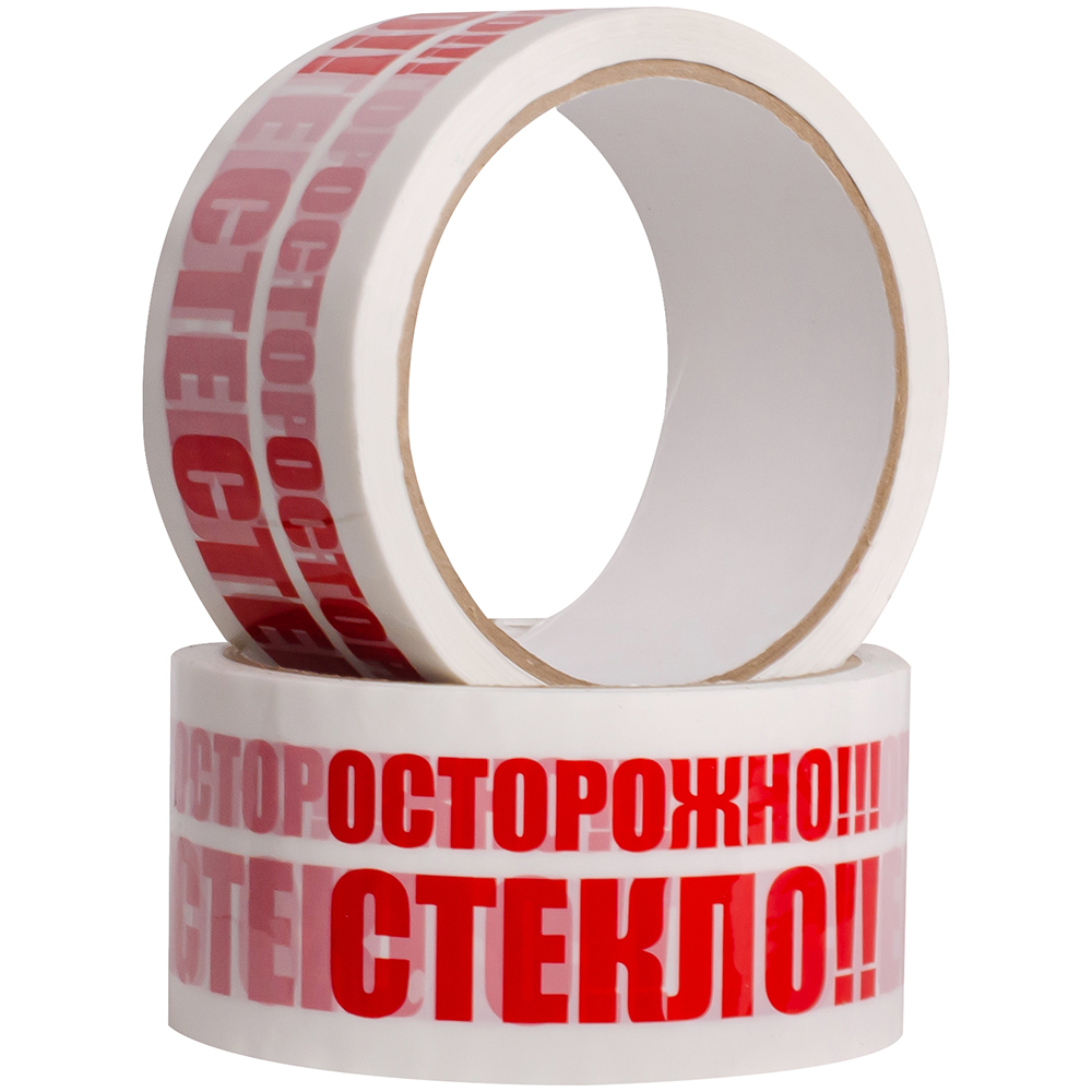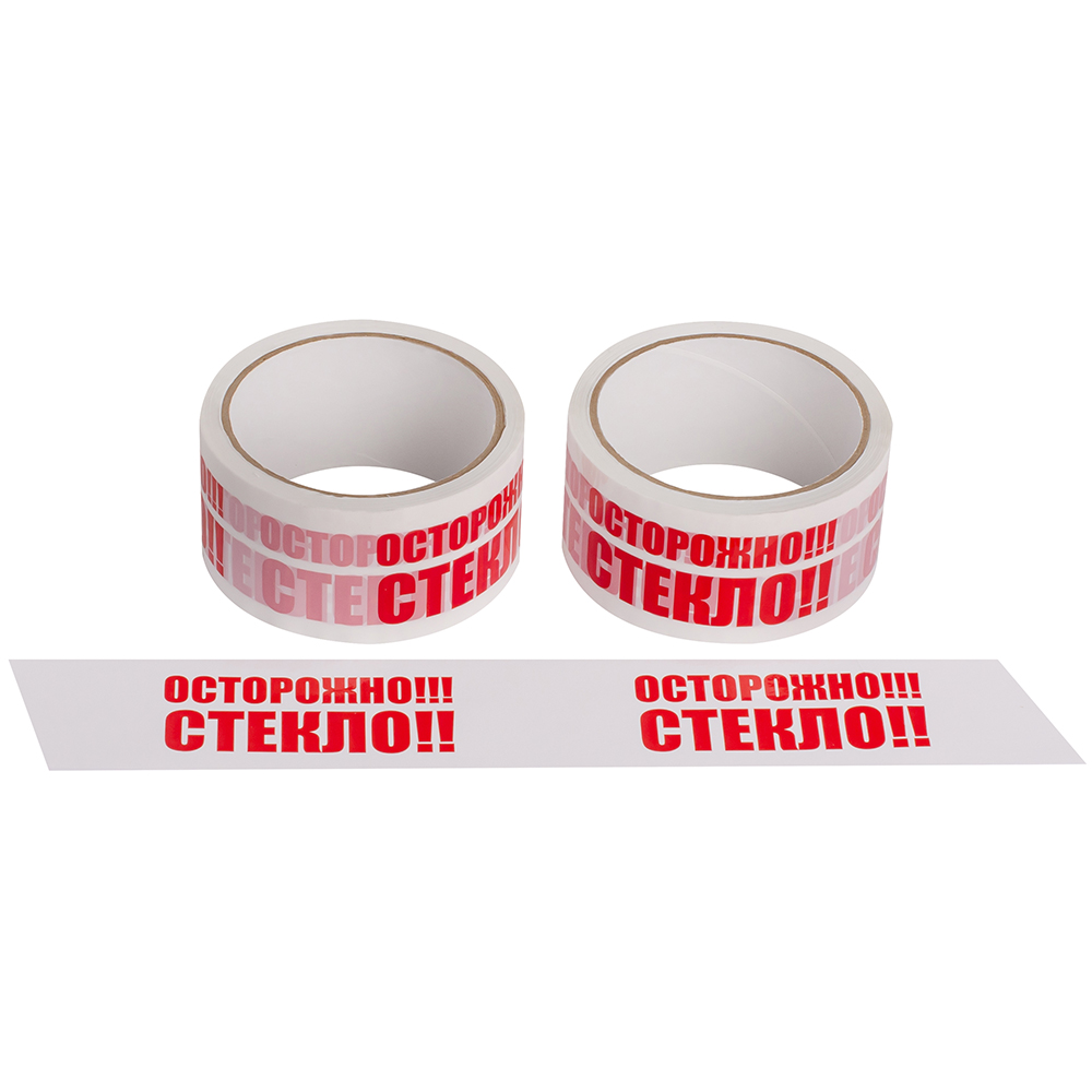 Клейкая лента с красной надписью «Осторожно стекло» шириной 48 мм, толщиной 47 мкм, диаметром втулки 76 мм, намоткой 66 метров. Изготовлена на основе полипропилена.