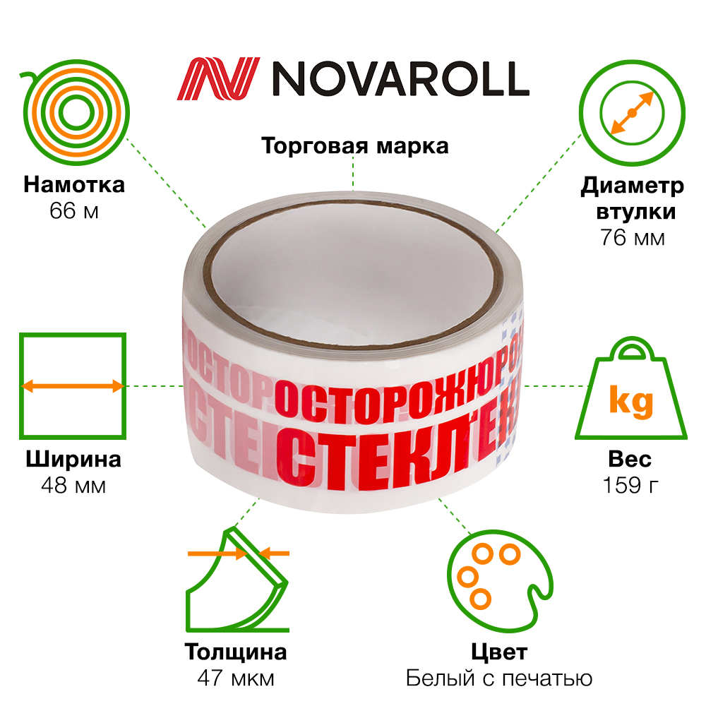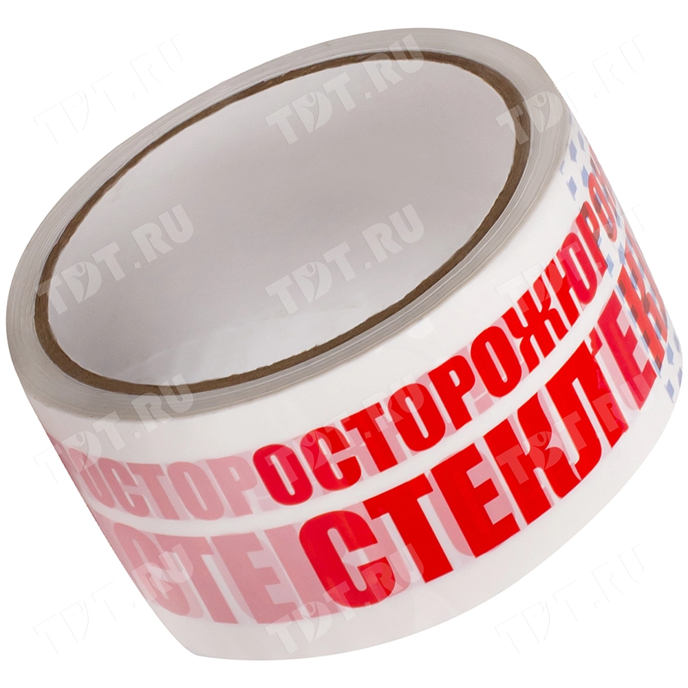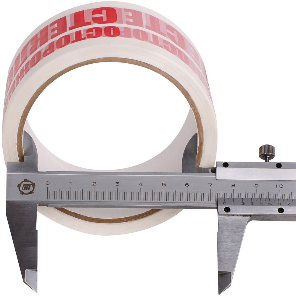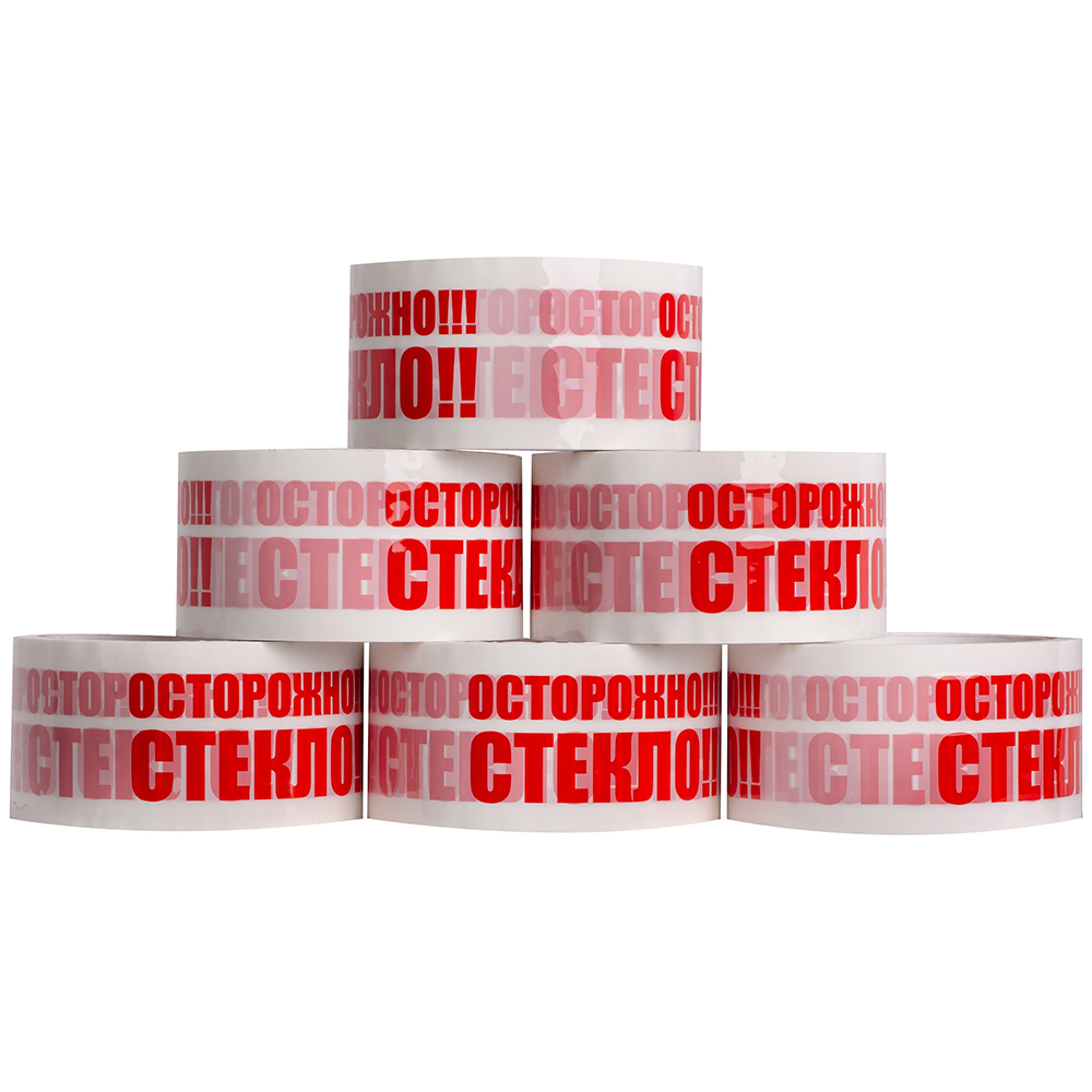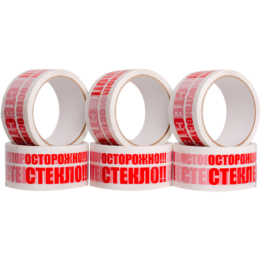 Клейкая лента с красной надписью «Осторожно стекло» шириной 48 мм, толщиной 47 мкм, диаметром втулки 76 мм, намоткой 66 метров. Изготовлена на основе полипропилена.