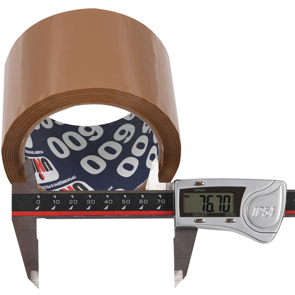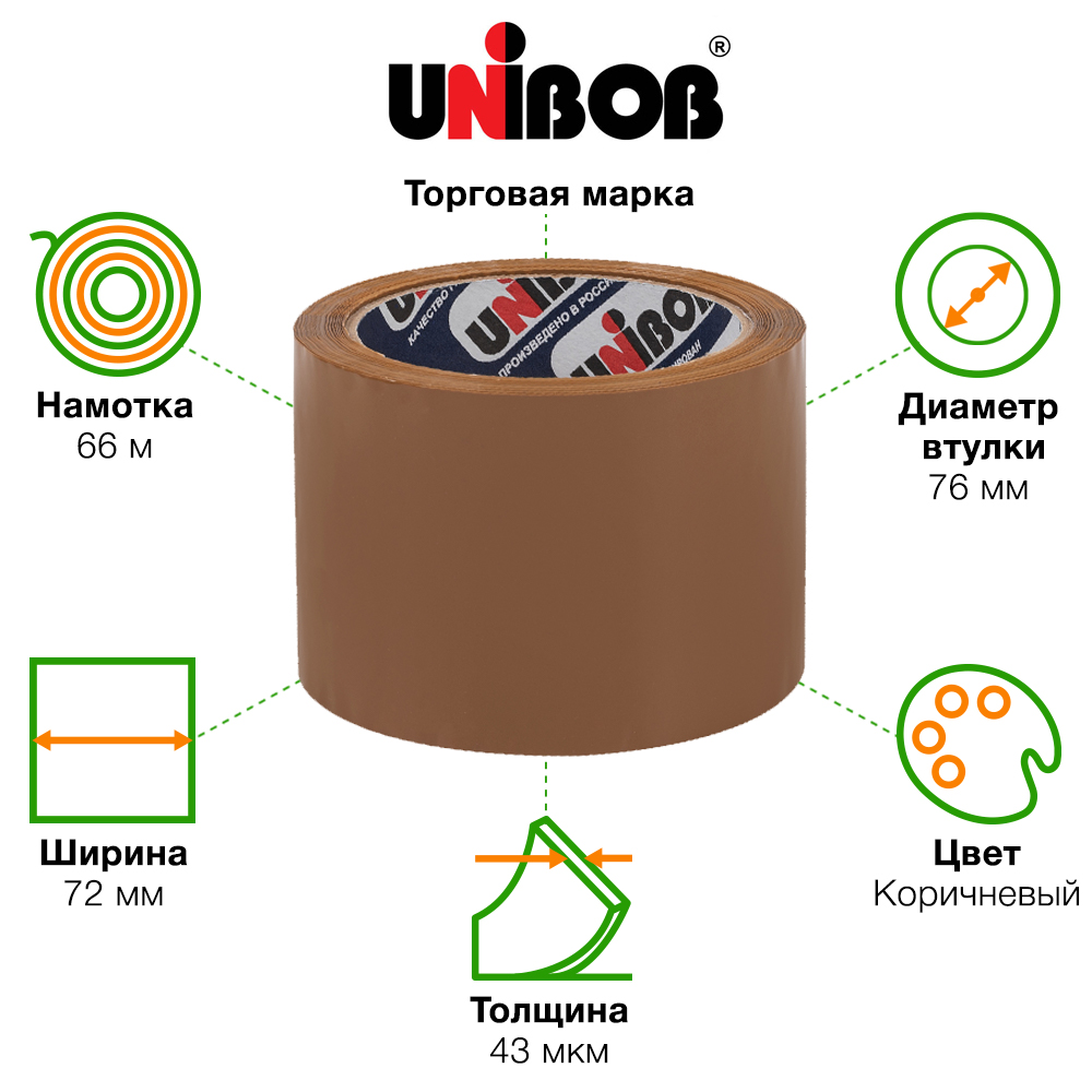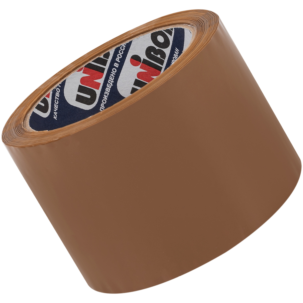 Широкая клейкая лента Unibob® коричневого цвета, шириной 72 мм, диаметром втулки 76 мм, намоткой 66 метров, толщиной 43 мкм для ручной упаковки.