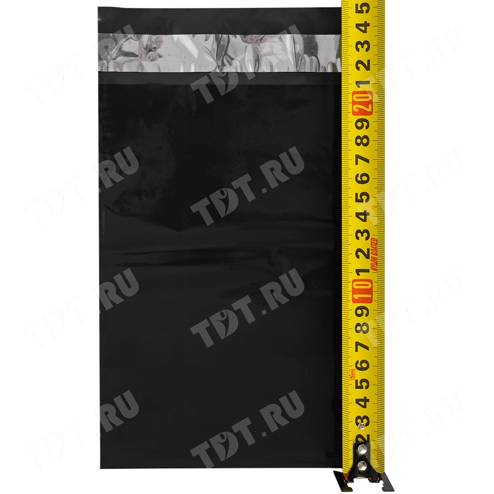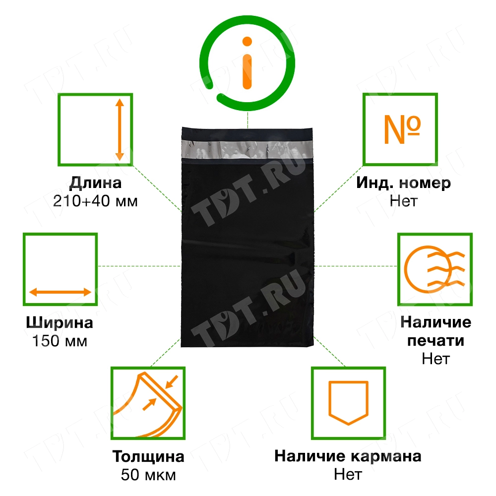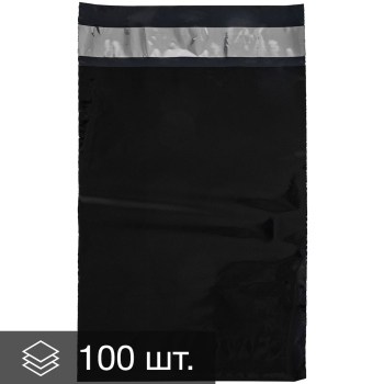 Чёрный курьер-пакет без кармана, без печати, длиной 210+40 мм, шириной 150 мм, толщиной 50 мкм. В упаковке 100 штук.