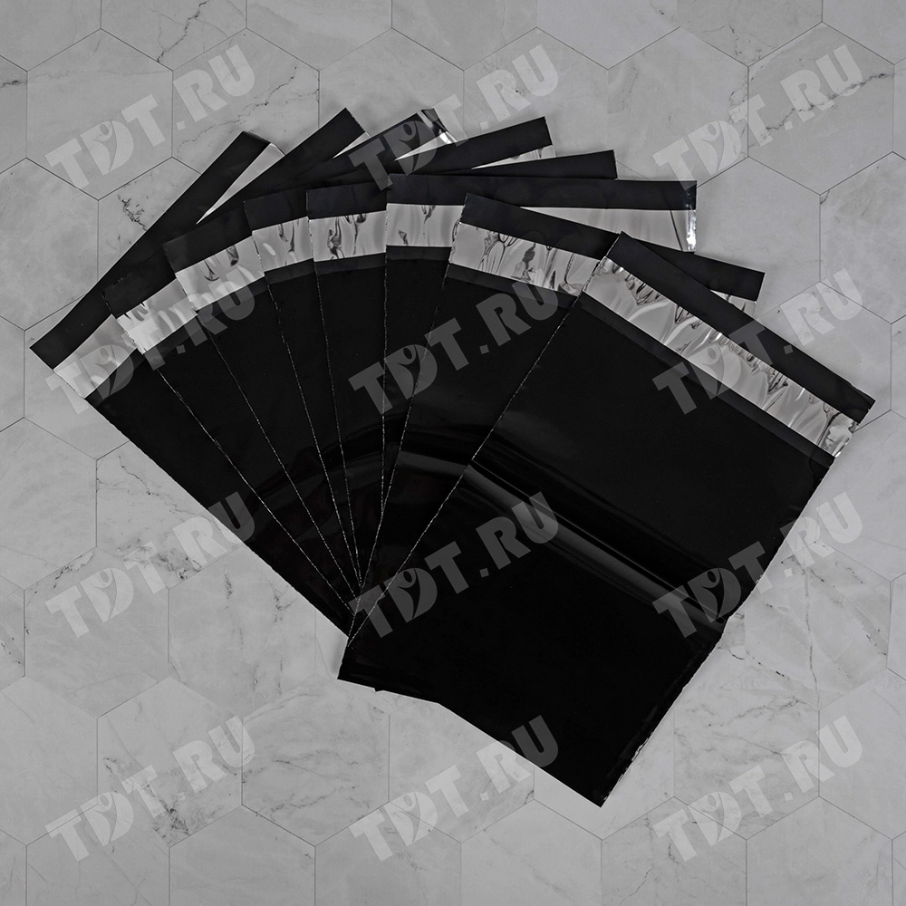 Чёрный курьер-пакет без кармана, без печати, длиной 240+40 мм, шириной 170 мм, толщиной 50 мкм. В упаковке 100 штук.
