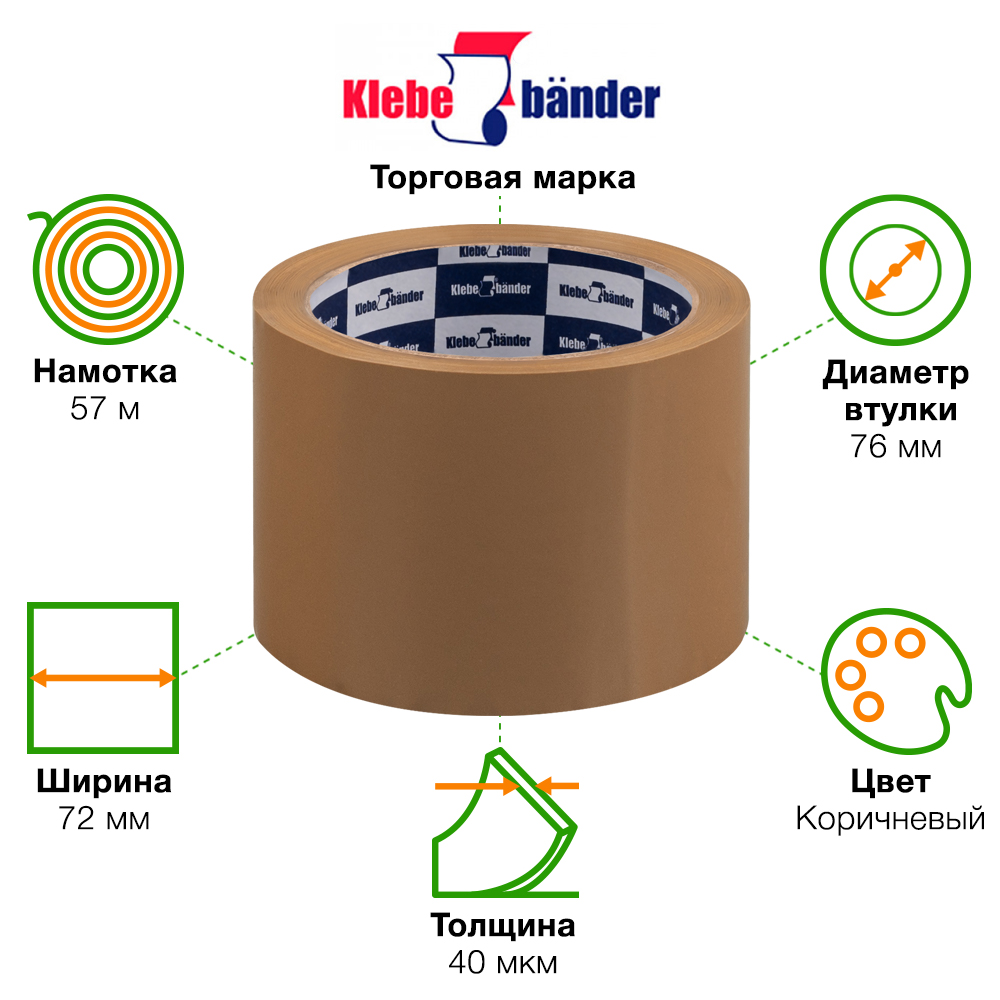 Широкая клейкая лента Klebebander коричневого цвета, шириной 72 мм, диаметром втулки 76 мм, намоткой 57 метров, толщиной 40 мкм для ручной упаковки.